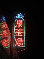 銭湯といえば下町、というイメージが一般的だが、神戸では必ずしもそうとは限らない。 新開地から六甲の山並みへ向かって1kmほどぐいぐい坂を登り詰めると、山麓に鎮座する熊野神社。さらにその裏手には、氷室神社へと続く急なナナメ坂がある。 その坂を登る。夏場ならば汗みどろ、よもやこのような場所に銭湯なんぞ……と腹さえ立ってきそうなその瞬間、目の前に白亜の伝統的な凸型銭湯が忽然と姿を現した。 湯の町浴場――その珍しくも情緒あふれる屋号、そしてアーチ状のモダンなヒサシが、ここまでの苦労をねぎらってくれるかのようだ。 ![]() (左)坂の上のフロ (右)エレジーを感じる屋号 暖簾をくぐり、玄関靴脱ぎスペースを経て中へ入ると、番台には常に微笑みをたたえたおやじ様が座っておられる。 脱衣場は阪神大震災の後に改装されてツヤツヤと美しいたたずまいながら、高い格天井は昔ながらの風格を漂わせている。 よく見ると浴室との間の壁はたいへん分厚く、中にX状の補強鉄骨が入っていて、震災を生き抜いた神戸銭湯の静かな迫力を感じさせられる。 阪神大震災を生き延びた格天井浴室は山際の立地にしては広さがあり、湯船は奥壁に沿って深・浅(気泡)・ジェットの3槽が並ぶ東京ふうの配置。 そしてその手前スペースに出ました! 神戸名物、くみ出し洗い専用槽だ。 楕円形で幅50〜60cmほど、長さは2メートル少々というところだろうか。そしてその周囲を大阪式の腰かけ段が取り巻いている。 むろん、この汲み出し洗い専用槽に浸かるのはご法度だ。 ![]() (左)手前に汲み出し専用槽、奥に湯船が並ぶ (右)入浴禁止 これは非常に便利な設備で、頭も体もあっという間に洗えてしまえる。大阪のように人が浸かっている湯船から汲み出すのではないから、より清潔だ。 でも俺の知る限りではどういうわけか神戸・明石と韓国にしか存在しない。 そして神戸でもこの湯船のある銭湯はどんどん減ってしまい、今では長田区の扇港湯や本庄湯くらいにしか残っていない。非情に貴重なものだ。 もちろん壁際にはカランもあり、隅に立ちシャワーもある。 もう一つこの銭湯の特長は、六甲山の湧水を沸かした、湯船たっぷりのお湯がじつに心地よいことだ。 さらに、かつて赤ン坊がたくさんいた時代の名残から、脱衣場・浴室ともに、女湯のほうが広く造られているのも興味深い。 坂を登った苦労が報われて余りある、味わい深き銭湯だ。(2009.4.19) 夜の町の湯の町※「レトロ銭湯へようこそ関西版」に掲載されました。 (本書が買える銭湯一覧) |