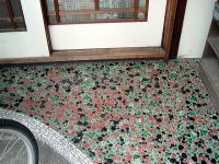 開店前に通りかかったのだが、あまりの風情に素通りできず、近くのびっくりドンキーでハンバーグランチ&ビールで時間つぶしてまで入ってもーたがな。 河原町丸太町の1筋東を上がってすぐのところ。京阪丸太町駅からなら鴨川を渡って徒歩2分。 それにしてもよいではないか、この外観。 京都らしいこじんまりした間口、2本の石柱に挟まれた狭い入口。青く塗られたスチール製アーチがまたよろし。 暖簾の下には石の敷かれた玄関スペースが見えるが、その半円カーブのしつらえが心の琴線にキュキュッとくるねぇ。なんかもう、この暖簾をくぐるシアワセ〜っちゅー感じやね。 ![]() (左)門柱上の三角帽子に手書きです (右)このカーヴ! 白タイルがまたなんとも んで、くぐったらコレ見なはれ。このカラフルな豆タイル! イチョウの葉の形をしたものもある。この上に足を置くシアワセ〜を貪るがよい。 ![]() (左)この手の不揃いなタイルを見ることが減った (右)下駄箱これもん ![]() (左)デュランタに引き戸、よろしおす (右)玄関の石畳をしげしげ眺むる 戸を開けると小さくて古い番台、ややっ、これははじめて見るタイプかも。中に人がすっぽり入るのではなく、前の机部分がなくて椅子状になっている。 小ぶりな脱衣場には90cmの熱帯魚水槽があり、グラミー種などが気持ちよさそうに泳いでいる。その背後の男女仕切り壁も変わった形で、その上には招き猫とデコッパチみたいな古い人形が置かれている。 天井は床同様の古い板張りで、金属4枚羽のプロペラがぶら下がる。 脱衣箱も木製で、真ん中にガラスはめ込み型。京都式の柳行李ごと入れる奥深いタイプ。しかも鍵はゴールドの真鍮だ。どっしり重い。 ![]() 浴室の手前には流しスペース。ここの床にも不揃いの豆タイルが張られており、やはりイチョウ型のもある。 浴室もこじんまりしているが、意外にも男女隔壁沿いに各種浴槽がズラ〜リ並んでいる。手前から水風呂、浅、深、ジェット、入浴剤入りの気泡風呂。さらにその奥にミストサウナ室がある。脱衣場のような古い雰囲気はない。 深い主浴槽には階段状に湯が落ちてくる仕掛け。たんなる飾りにしては狭い浴室で場所をとっている。 ゆったりと湯舟に浸かる。カマボコ天井に広い湯気抜き、明るい時間帯の極楽銭湯を堪能ぢゃわい。 そして京都らしい、大阪や神戸とは異なるタイルをなでなで。 カランの水は、夏なのにかなり冷たい。井戸水だな。うむむー、ええぞぉ。 サウナと水風呂のせいか、他の客もけっこう長湯していた。 風呂上り、脱衣場で飲むヨーグルトぐいっといっとこ。 いやー、ええ感じの脱衣場やわ。 (2004.7.23) 京都をたっぷり味わえる銭湯※2011年12月、関西てくてく銭湯開催! ※その後、浴室が改装され、鯉の泳ぐ水槽が設置されました! |