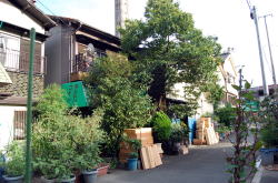地下鉄四つ橋線の北加賀屋駅から東へ3〜4分。大通りから1筋奥に煙突が見える。 近寄ってみると、ふいにボーボーと木が茂ったところがあって、その入口付近に材木が積んである。薪沸かしの燃料らしいが、長年積まれたままの薪にまでカズラ類がはびこっている。大規模な団地群の中にあって、ここだけ原始林の中の炭焼き小屋みたいな風情になっとるぞ。 ![]() (左)自然ってすばらしい (右)表へ回る 表へ回るとふつーの風呂屋。間口横断シルバーパネルが昭和40年代的な改装を物語るが、凸型玄関の両脇に前栽があるクラシック構造はそのままなのね。 オーソドックスな玄関下足場を抜けて中に入ると、番台におかみさんが座っている。 脱衣場はなかなかのノビノビ空間やおまへんか。脱衣箱はアルミ製に変えられているが、木枠ガラス戸を隔てた前栽にはナンテンの緑が茂り、天井には木製の3枚羽プロペラがぶら下がる。昔ながらの脱力空間ね。 浴室に入ったらば、これが大阪の風呂やで的にド真ん中に石の湯船ドーンの四方風呂。周囲の腰かけ段は外フチが石造りで、内側にはカラフルな小石タイルが貼り込まれている。 この中央主湯は深・浅・ジェットの3槽に分けられていて、ジェットは座り風呂になっている。ジェットの両脇には黒い小石タイルがびっしり貼られ、深風呂ではライオン口が湯を吐いている。 奥にはデンキと薬湯(森林浴)、こいつが寝風呂になっていて腰のカーブがたまらんナイス。そしてなんと無料乾式サウナに水風呂(残念ながら非冷却)ときたもんだ。 それら周辺からカラン下などあちこちに、小石タイルや花柄タイル、緑色の渋いタイルなどが使われていて昭和の風情が満ち溢れとる。 まあそんなわけで激レトロというわけではないものの、薪沸かしの古典風呂にノビノビと浸かって湯あがりにビックルでも飲んでボーッとできる、銭湯よかですたい系のしみじみ風呂屋なのね。(2011.8.9) |