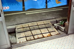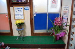 地下鉄四つ橋線の北加賀屋駅から北東へ徒歩4分ほど。市バス「造船所通」からなら南へ3分。 飲み屋なども並ぶ住商混在地の角地に、スッキリとたたずむ大阪伝統凸型銭湯あり。なかなか素敵な面持ちへおまへんか〜。 ![]() (左)真新しい看板がやる気の証明 (右)モザイク屋号がファンシー 最近この手の銭湯がどんどん廃業するから、真新しい営業案内看板を見るとホッとするなぁ。 入り口の溝に架けられた木製スロープを越えると、スッキリした玄関で美しいランなどの花が出迎えてくれる。傘たての手前にはかわいい白い椅子がある。靴の紐を結ぶ人へのちょっとした配慮だな。 もうこのへんで経営者の人柄がわかっちゃうねー。 ![]() (左)木の板ステキ (右)お花ステキ 戸を開けると、出ました! 半楕円の木製ゲージツ番台。 そしてやさしげなおやじさんは、お金を払うと「ありがとうございます」と言ってきちんと頭を下げる誠実なお人柄。 そこそこ広い脱衣場は昭和的に改装されているが、天井にある巨大な木製2枚羽プロペラが迫力だ。広めの前栽もよい。 そして一角に無料ボックス式サウナが設置されているが、これ新品だ! 浴室は白タイル壁ときれいに塗られた青天井に包まれ、壁画などは何もナシ。 床はタイル張りだが溝が一本も切られておらず、何ヵ所かの排水穴に向かって全面が微妙に傾斜するイニシエタイプ。 浴室の奥は全面ガラス張りで、外は庭になっている。暗くてよくわからなかったが石灯籠などが置かれているようす。 ここをサウナ室などに改装する例が多いので、庭が残っているのは貴重だ。せっかくなので前栽とともにライトアップしてほしいな〜。 湯船はほぼ中央に深浅主浴槽、それに一部つながってデンキ。浅にはジェット3連、頭を置く段がつけられていて快適だ。 石造りの湯船は、よくある黒御影ではなく白っぽい花崗岩が使われている。神戸の浜添湯などと同じで、俺はこれを石臼浴槽と呼んでいる。デコボコ感が気色よし。湯船内側のタイルは張り替えられたばかりのようで目地が真っ白だ。 湯船外側をとりまく腰掛部分は、へりの石とまたぎの石との間に青い円形の豆タイルが張り込まれていて美しい。 水風呂はないが、出入り口の左右に水鉢と立ちシャワーがあってOK。 お湯に入ったり水をかぶったりしながら、のーんびり長湯ちゃんね。 上がりは飲み物やアイスなどいろいろあるが、一角にポットと紙コップが置かれている。おやじさんに「これはよばれていいんですか」と聞くと、「何杯でもどうぞ」とおっしゃる。横には「ルイボス茶」のポスター。 飲むと香りよく、すきっと冷えていた。ナイスサービス! 全体に伝統的な造りをそのまま残しつつ、タイルなどはこまめに補修され、どこもピカピカに磨き上げられていて清潔感ばりばり。 番台・扇風機・石湯船のほかに古いものはあまりないが、玄関の花や冷たいルイボス茶、丁寧な応対など、経営者の愛情と真摯な姿勢がひしひしと伝わってくる。 なんかちょっと嬉しくなる銭湯だ。 (2011.2.15) |