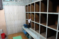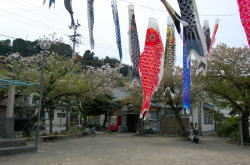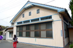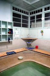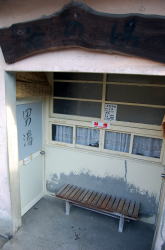 亀川を代表する市営浴場、町名にもなっとります。 五月の節句を前にして鯉のぼりが乱舞する公園の奥に、味わい深き平屋建て青瓦あり。 この公園ほとんどが桜の木だ。残念ながら花はほぼ終わりかけているが、もう少し早ければピンクに埋もれそう。 のどかなな〜入り口には番台ブースがあるが、その前に椅子を出して女性が座っている。100円を払うと、「洗面器持ってます?」と聞かれ、持ってないと聞くと1つ貸してくれた。 (あとでネットで見ると「洗面器料金をとられた」といった情報があったが、俺はとられなかった。たまたまなのか徴収をやめたのかは不明) 浴室は地下にある。階段を半回転しながら下りてゆくと、けっこう広々した浴室が登場。 壁面に沿って風呂場から一段だけ高くなっており、ズラリ並んだ脱衣棚の下に靴を入れるようになっている。 おやっ? そっけない浴室が多い別府共同浴場にあって、なんだか明るいぞ。 浴室の床は赤茶色とクリーム色の細かなタイルが交互に張られ、小判型の湯舟内側は空色のタイルやおまへんか。 しかもロッカー上はほぼ全面が窓になっていて、そこからの光が浴場全体をさんさんと照らしている。 それでいて木製の男女壁から天井をはじめ全体がエエ感じに鄙びておって、これはまぎれもなく俺様ストライクな風情やがな。温泉分析表も渋い。 風格ある湯舟は真ん中で2つに仕切られ、熱い湯とややぬるい湯になっているのもよろすい。お湯はやわらかまろまろ、やさしい湯だ。 昼下がり、7〜8人の地元民で繁盛していた。 いつまでも入っていたいようなナイス湯だった。俺、竹瓦よりこっちかも。また行きたいな〜。 (2011.4.17) 側面、窓が大きくて明るい |