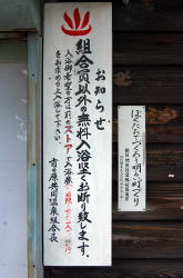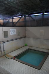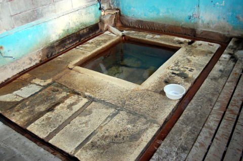 別府の温泉道の中では激渋としてつとに有名だ。 でも場所はやや不便なところ。鉄輪の南東1.5kmくらいの住宅地、道路に面して農機具の物置みたいな小屋がある。 よーく見たら「市の原共同浴場」との看板が出ているが、それよりもここを有名にしているのが「おたふくわた」の看板だ。 ![]() (左)地味な看板 (右)派手な広告 もちろん番台などない。向かいのコンビニで入浴券を買うシステムになっている。って、べつに「システム」などという英語をここで使わんならん話ではないんだが。 ![]() (左)ようするに、勝手に入んなよと (右)脱衣スペース 入ったら風呂場の手前に脱衣箱がある別府スタンダード。 でその風呂場がアンタ! ![]() こ、これは・・・素晴らしい。 コンクリ湯舟に刻まれた溝、澄み切った湯、そして湯船の底には大きな石が無骨に敷かれているではないか。 求めていた風景湯は熱いが、別府にしてはマシだ。じゅうぶん浸かれる。 隅に水道のカランがあるので、体を冷やしちゃ何度も浸かる。 窓から差し込むのどかな光と、車が行き交う世間の音。 外界とボロイ板壁1枚をへだてて、この時間も脈拍も止まりきったような別空間で、こんこんと湧き出す湯にぼんやり浸かっている俺。 はは、なにこれ。 言葉で表すとしたら、超越、しかないなぁ。 わざわざ遠くの温泉へ出かけることの意味と答えが、ここにある。(2008.10.6) |