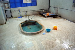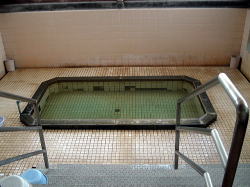 文化財に指定されているというノスタルジックな駅舎の東別府駅、そのほぼ駅前にある年季の入り倒し系の共同浴場。 くすんだピンク壁がただもんやないオーラを放っとりますがな。 東町温泉、の文字も渋い白く塗られた木の番台ブースがまた泣けまんがな。ここにフレンドリーなおばちゃんがいて100円払う。 「経営難につき無銭入浴禁止」との張り紙がある。コラ、払えよ100円ぐらい! ![]() (左)入ったところの番台もシブシブ (右)この手作り感が最高 そこから階段を下がって地下に脱衣場と風呂場があるパターンだが・・・むむっ、なにこれ、この奇妙な孤独風景! ![]() (左)広々浴室にミニ湯船ポツリ (右)天井も高くてとにかく広々(空間だけは) 瞬間的にSOSを打電しそうになるが、よく考えたらインド洋をさまようゴムボートちゃうやん。船は船でも湯船やん。 漂流の心配は低そうだが、湯に浸かるさいには念のために1週間分の水と食料を持っておくほうがいいだろう。 丈夫な石の船お湯は広大な浴室隅の激熱源泉畑から少しずつ流れこんでくる。無色透明無味無臭のあっさりタイプでくせがない。熱めの湯がじわじわ体にしみこむねぇ。 それにしてもこの部屋の広さと湯船のプチさのアンバランスが方向感覚を狂わせる。日本はどっちだ! 最初は広すぎて落ち着かないと思ったが、慣れてくると不思議と解放感が満ちてきて、いつしかひとり湯船で笑いがこみ上げてくるからワカランものだ。 俺、なんか狂った? (2011.4.17) |
