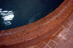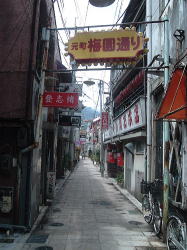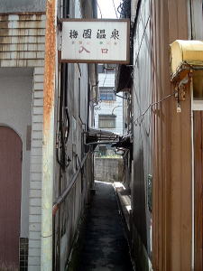 去年別府へ行った友人が「駅周辺ではここがいちばんよかった」と言っていたので、当然俺も訪れた。 竹瓦温泉からアーケードのソルパセオ銀座へ出て右へ行き、最初の路地を左へ入る。するとこんな看板がある。 梅園通りそして少し進むと冒頭写真の、猫の抜け道みたいな激狭路地に看板が出ている。ここが梅園温泉の入口だ。 建物自体は左側のボロアパートのような2階建て。 ここでいきなりの夕立だ。あわててもぐりこむ。 入口には誰もいないが料金箱がある。100円を入れて中に入るといきなり脱衣箱、そして2段ほど下がって小さな風呂場。半地下とまではいかないが、コンクリ天井は低く、雰囲気のディープさは思い切りアンダーグラウンドだ。 だけどこの楕円形の湯舟、床タイル・・・これはイイ! おぉ〜っと声が出る他客は地元民が3名ほど。ほどよくうめられて俺的ベストの43度くらいだが、地元民のおじさんは「熱かったら言ってよ。こっちから水が出るよ」と気安く声をかけてくれる。 あぁ、こりゃエエお湯や。隅のマスには熱湯がゴボゴボ言ってるが、木の栓で少しずつ湯舟に流れ込むよう、先客がうまく調節してくれている。 右手の壁にはむき出しのパイプが走っていて、水カランが3つある。 雨はますます強くなる。窓の外は数十センチで隣の建物の壁が迫っているが、それでも開いた窓から吹き込んでくる。 「この2階は何に使われてるんですか」 先客のおじさんに聞くと、 「以前はいろんなことに使われてたけど、今はほれ、あの通り歪んできとるけん、危ないからもう使ってないじゃろ」とおっしゃる。見ると、確かにコンクリ天井の梁が落ち込んできている。建物の耐用年数はとっくに過ぎている感じだ。 ザアーっと響く激しい雨。狭い空間に立ち込める湯気。静かに語らう地元民たち。湯舟のへりでゆっくりとヒゲを剃る俺。 もう、これ以上はない。精神的国境を越えている。 「上がるときはこの栓をね」 熱湯の出口に木の棒を差し込むことを俺に教え、先客は雨の中を出て行った。 泉質のウンチクなど、少なくともここでは関係ない。地面からお湯が湧き出てて、その湯と人がずっとともにある。それだけのこと。 もちろん、それで十分だ。(2007.8.13) ※2015年にタイルが新しく張り替えられました。 |
