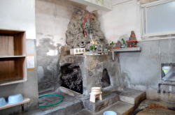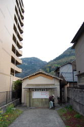 貸間の地獄蒸し料理で飲みすぎ食いすぎの鉄輪の朝。とりあえず朝風呂でヌかねばな。 徒歩圏内に7つある共同浴場のうち、ちょと外れた川沿いにある谷の湯が渋いっちゅー話なのね。 貸間で借りた下駄カラコロゆわしながら小さな川沿いを歩いていったら、なにやら湯気に巻かれてそれらしき建物発見だ。 ![]() (左)いたるところ噴気がすごい鉄輪 (右)外壁じか書きの味わい 正面に回りこむと、半分地下に埋まったような状態でじつに味わい深い。左の家に窓口があって100円を入れるようになっている。 チャリンとゆわして階段を降りたら入り口がある。マジックで「男湯」との殴り書きがじつに味わい深い。 中に入ると脱衣棚、2段ほど下がって浴場という別府スタンダードな素朴湯だが、谷間にあるためか非常にこぢんまりとした空間だ。 ![]() (左)谷底風呂? (右)奥の筒から熱い湯が出とります 奥にカランがあって、先客のイレズミジモティ1名が体を洗っている。 その横になにやらドーム状の井戸みたいなのがあり、上に不動明王が設置されているではないか。 ![]() (左)謎のドーム (右)お不動様 井戸をのぞいたがカラッポ? イレズミジモティに「これは何ですか?」と聞くと、 「そこに井戸があったけど涸れとるよ」とのこと。 そのオヤジが出て行ったあとは貸切となった。 お湯はかなり熱めだが入れないことはない。鉄輪らしい無色透明の澄み切った湯だ。 朝っぱらから谷間のいで湯に抱かれて、不思議な空間でゆっくりとひとときを過ごす。 静か。静かね。そうだ静かだ。と独り言もほかに話題なし。 いや贅沢よの。別府というものはの。(2011.4.17) 帰り道、反対側から振り返る |