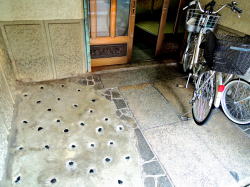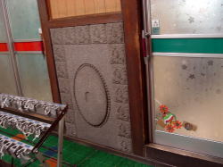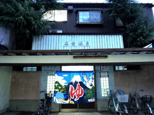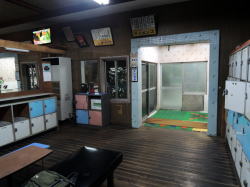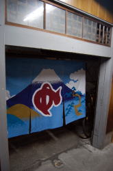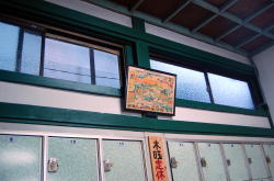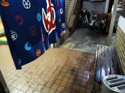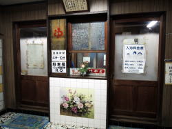 南海電車の鶴原駅から西へ数分。車ではキツイ古路地の中に忽然と現われる、古式蒼然たる銭湯。なかなかどっしりとした貫禄で、「ほ〜残っとるなぁ〜」と思わず声が出てしまう。 こういうのを見つけると嬉しいもんでっせ。ワカル? ワカルよね、こんなページを見ているアナタなら。 ![]() ![]() ![]() (左)暖簾をくぐると正面ゴチャゴチャ (右)古い木の下駄箱あり アルミサッシ戸を開けると、古くて立派な半円形の木の番台に、無表情なおかみが座る。 湯銭を問うと、「270円、髪を洗うなら280円」とそっけなく返ってきた。大将軍湯も安いがここも安い。それは嬉しいけど、今どき洗髪10円をわざわざとるって・・・時代が止まっておりますな。 中型の広さの脱衣所は合板系でそっけなく改装されている。天井は高いがベニヤ張り、前栽には大きな室外機があって風情イマイチ。 脱衣所と浴室が少し離れていて、間につなぎスペースあり。ここに小さなステンレス流しがこれまたそっけなくポンと設置されている。 浴室は昭和中期的な細かいタイル張りで、床は数箇所の排水口へ向かって大きく波打っている古いスタイル。 湯舟は広めの深浴槽と、ジェット2連の浅浴槽。へりと座り段は白御影石で、なかなかよろすい。とくに浅風呂の底の不揃い小石型タイルと壁際の丸い豆タイルが目を引く。 そして男女隔壁に、これはこれは、タイル6枚に描かれた富士山のタイル絵があるじゃありませんか。 しかしまー、壁やカランまわりのタイルはかなりくたびれとるな。補修が素人仕事で仕上がりがまあなんちゅーか、あまり見栄えがよろしくありません。 出入り口横に水鉢あり。 午後8時前後に入ったが、先客1名、途中から貸切になった。 上がりは飲み物いろいろあり。 建物は渋いし、石造りの湯舟やタイル絵など、なかなか味わい深いものがある。だが脱衣所や浴室の雰囲気から、経営モチベーション的にやや心配かも。立地的にもちょっと厳しいのかもしれん。 それでも、がんばって生き残っている貴重な古銭湯であることは確か。近所の人はぜひ応援しませう。 (2005.6.9) ![]() |