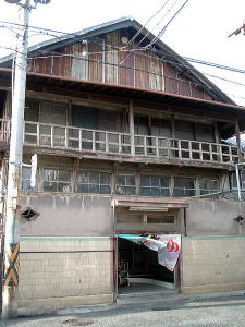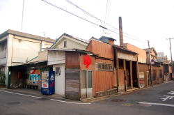 上で紹介している桜湯から100mしか離れていない。まじで。 しかも暖簾がかかっていなければ廃屋にしか見えない、凄みのある風貌。 最初、定休日に通りかかったときは、てっきり廃業銭湯だと思い込んでいた。銭湯が次々に廃業している岸和田のこと、こんなに2軒が近接してたら無理だわな・・・。 ところが次に前を通ったら、暖簾がかかっている! ![]() ![]() (左)この外壁タイルが渋い (右)2階は廃墟状態 暖簾をくぐると、広めの玄関スペース。正面に梅湯らしく梅にウグイスのタイル絵がある。下駄箱は木のものが一部残っているが、多くはアルミ製に替えられている。 ![]() ![]() (左)じつは現役 (右)このタイル絵、ヨイではないか 戸を開けて中に入ると、番台には誰もいない。呼んでも静寂のみ。番台にお金を置いとこか、でもこういうところは組合料金より安いことがあるしな。料金表もないし、ええわ先に入ったれ。 脱衣所の壁や天井はチープな合板で貼りなおされている。ロッカーも木のものが一部残っているが、大半は高度成長期的な集製材モノ。だが、鍵がひとつもついていない。全部壊れてます。 浴室へ。先客が3名いる。 ありゃりゃ、ここはきれいなタイル張りに全面改装されていて、建物外観から想像した古さはない。深浅の主浴槽と、奥に気泡風呂。隅に水鉢。カマボコ天井も新しい。 カランまわりも新しくてきれいだが・・・おや? 赤いほうを押しても水しか出えへん。こういうときはしばらく出してたらだんだんと・・・あかん、なんぼ出してもチベタイままやがな! 仕方なく湯舟の湯をかい出して使う。他客も当然、みんなそうしている。まあ湯舟はなかなかいい湯が沸いている。 上がると番台にほがらかなばあさんが座っている。湯銭は370円、大阪府料金より20円安い。 この建物は、ばあさんによると「100年から経ってまっさかい」。隣家と密接しているため建て替えも難しく、今日に至っているとのこと。 「岸和田も風呂屋が少のうなりました」 マッサージ器に座ってスコールをしみじみ飲んだ。 (2005.11.8) ![]() |