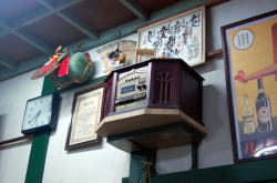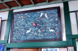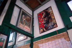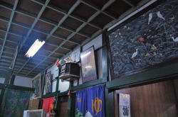 らんちゃんに「ここはいいですよ〜!」と強く薦められていた。 JR阪和線・信太山駅を出て正面の道をまっすぐ(西)へ歩くと、3分くらいで「ゆ」という大きな赤い文字が見えてくる。 建物はどこにでもありがちな昭和中期型だが、裏へ回るとゆったりした敷地に高い煙突が聳え、脇に積まれた廃材風景がなんとも三丁目の夕日。 ![]() ![]() (左)中央の「ゆ」の字が目印 (右)鯉のぼりでもくくりつけたくなるねぇ 暖簾をくぐると下足室、なかなかの田舎風情。正面に宝船のモザイクタイル画があり、古い下駄箱の上には他で見たことのない傘入れがある。 中に入るとけっこう広々している。番台に品のいいおかみさんが座っているが、200円とは嬉しいやおまへんか。 と、ここで驚愕。この銭湯、違う! 並の風呂屋ではない! 緑に彩色された格天井や柱などのイニシエ風情もよいが、それ以上に、壁に飾られたレトロな絵や物品の数々に目が奪われる。なんやここは! ![]() ![]() (左)美しい格天井 (右)入口側の壁 ![]() ![]() (左)番台頭上の激渋ラヂヲ (右)むむっ、これは・・・ ![]() ![]() (左)恐るべき化粧水広告 (右)マニア垂涎の初代ガッヅィーラ・ポスター ![]() ![]() (左)バリ島で購入されたものらしい (右)ロッカー上には明治頃の伊勢参拝絵図 ほかにもいっぱいあるが、雑然とした感じはまったくない。選び抜かれた品々が、適切な場所にセンスよく配置されている。 建物と調度品が見事に調和して、まるで脱衣所全体が小さなレトロ美術館のような趣を呈しているのである。もう俺、興奮してフルチンで三脚振り回しちゃったよ。合わせて6本が大暴れだ。 さて、浴室は素朴な昔ながらの空間だが、ここもまたなにかと楽しめる。 まず目に留まるのは、浴室の三角に配置された観葉植物コーナー。それぞれに信楽タヌキや大国様みたいな置物が添えられている。 そして奥壁にはお寺の、男女壁には鯉のタイル絵がある。 ぷくっと膨らんだ懐かしタイルの主浴槽はやや熱め、奥にある「中将湯」の薬湯はややぬるめ。壁には注意書きがマジックでじか書きだ。 洗い場にシャワーはないが、カランの出がいいので問題なし。カランの水は冷たくて気持ちがよく、何度もかぶりたくなる。 あがっておかみさんに聞くと、ここの井戸は300mも掘られたものだという。どうりでなあ。 「この渋い品々を集められた方によろしく」と言うと、「いま釜で火を焚いてます」とのことだった。 とにかく、イニシエ風情と趣味のいいコレクション展示がスパーク、しかも水質が抜群によいという、脱帽したくなるようなくつろぎの銭湯だ。(2008.5.1) ※「レトロ銭湯へようこそ関西版」に掲載されました。 |