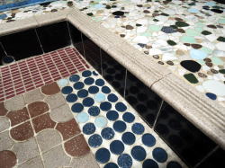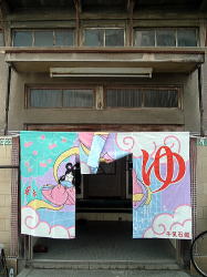 岸和田市のようだが最寄駅は南海忠岡駅。 そぼ降る雨の中を歩くにつれ田んぼ混じりの片田舎風景へと移ろい、「焼肉ひょうたん屋」で右折するとまもなく岸和田市に入る。 そこにひっそりと1軒の風呂屋発見。 ![]() ![]() (左)見えてきた (右)反対側の道はクランク状になっている 左右に前栽がある凸型玄関。木彫り屋号もそのまんま。玄関周りのガラス類も昭和モロ出しの風情だ。 ![]() ![]() (左)細かいタイルと古いガラスブロック (右)このガラスもナカナカ渋い 営業案内の掲示が何ヶ所かにあるが、定休日「日曜日」「金曜日」とか「11時まで」「10時半」「10時」とかいろんなことが書いてある。 いちばん新しい紙によると金曜定休、4〜10時、みたい。 ガラス戸を開けると、いにしえ素敵な玄関スペースが迎えてくれる。 浴室の床タイルが補修でパッチワーク状になっているのはよく見るけど、ここは玄関の床からすでにパッチがワークしとるやん。 ![]() ![]() (左)木の扉が泣かせる (右)これどっかでも見たな ![]() 中に入るや、大音量テレビドラマが入浴客を迎え撃つ。番台のバーサマはちと耳遠いんかな? でも落ち着いて脱衣場を見回せば、ここもまた味わい深いレトロ空間やおまへんか。板の間の床がひじょーによろしい。 浴室入口部分が奥まって、中庭と流しの連結部分がある。この手の大阪レトロ系では珍しい造りだ。 ![]() ![]() (左)コゲチャ色はレトロ色 (右)奥まり 裸になって奥へ進むと、入って右の水鉢で壷持ちビーナスがお出迎えしてくれる。 この浴室も古めかしい静かな空間だ。主湯は深浅四角で隅カーブ、フチ石ノセ。深浅分け目がカーブに合わせて窪んでいたりする。 お湯は熱めの43度くらい。ジェット類一切なしの潔さ。 奥に岩を組んでジオラマ風になった電気風呂があるけど通電していない。岩の上方に大黒らしき像がある。 奥壁にはドイツ城らしきモザイク画があり、男女壁には天女が飛ぶ美保の松原富士山のタイル絵もある。 湯船まわりの座り段やカラン下には大きめの円形タイルが使われているのが目を引く。シャワーの水圧は弱いけど、床や浴槽などの手作業タイル補修を見ていると許さざるを得ない。 若干くたびれ系な雰囲気もあるが、なにげに見どころも多い。街はずれで静かなひとときをしみじみと過ごせる、昨今貴重なお風呂屋さんだ。 (2014.2.27) |