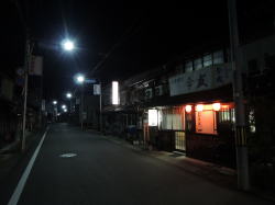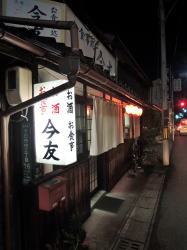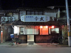 三次駅から西へ10分ほど歩く。市役所前を通り過ぎて馬洗川の少し手前を右へ曲がると、古めかしいまちなみが連なっている。 日が暮れて真っ暗な中、骨董品のような旅館の向かいで1軒の食堂に灯がともっている。 1階部分の屋根に乗った屋号看板があまり見ない形状で、そこに大きく筆書きされた「今友」の文字が心を鷲づかみにしてくる。 素通り不可能な店構え店内はそこそこ改装されて明るく、思ったより古臭さはない。 カウンターと座敷があり、高齢のおやじさんと中年の息子で切り盛りしているようだ。どちらも控えめな印象。 他客おらず壁の短冊ではうどんや丼物が400~500円台、おでん1個100円、手書きボードには一品ものがいろいろ。山あいのまちらしく「川ハエの甘露煮」とか「ししとう味噌」とか、なんかの煮こごりなどもあって気になる。 ![]() (左)何の刺身やったかな・・・ (右)川ハエ甘露煮 ![]() (左)ししとう味噌 (右)鴨鍋800円 どれも安い。ほかに客もおらず、頼んだものが着々と出てきてありがたい。 短冊メニューはおやじ、ボードは息子と分業しているような感じもする。 メニューに「手打ちそば」があったので、「とろろそば」を頼んだら、これは手打ちではなかった。 「手打ちそば」だけが手打ちらしい。 それにしてもこの暗く静まり返った古い通りで、こんな感じのいい店がこの時間に開いているのは奇跡だ。 夢を見ているかのようだった(2014年12月) |