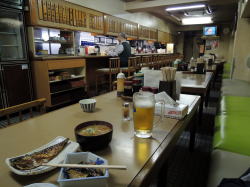 広島市街地の真ん中、広電とアストラムラインの本通駅から徒歩3分ほど。 入ってすぐ左手におでん器とおかずのガラスケースがあり、奥へ長くテーブル列とカウンター席が続いている。なかなかの収容力だ。 居心地よし店内は美しく整い、店員のおばちゃんやカウンター内の大将の対応もいい。 ただし値段は、うどん400円、ラーメン550円、カレーライス600円、親子丼700円、瓶ビール大700円など大衆食堂としてはややお高め。 でも一品もののおかずが豊富なのと、めし(大160中150小130)や汁(味噌汁100円豚汁150円)が安いので、組み合わせてマイ定食を作ったり、居酒屋づかいをするもよし。 おでん器も大きく、独特の真っ黒いだしにいっぱい浸かっていてそそられる。 老若男女が利用しやすい、ザ・大衆食堂の優良店だ。 (2014年12月) |