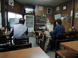 栄食堂から43号線にかかる歩道橋を南へ渡って右手に、古びた食堂がある。 中へ入ると、細かいタイルがびっしりと張られた床の上に、テーブルが5つ6つ。出入り口横におかずのガラスケースがあり、奥の厨房前に年季の入ったおでん器。 見事に時間が止まっている。 ![]() ![]() (左)厨房手前とおでん器 (右)出入り口方面 昭和39年にバラックで食堂を始め、今の建物に建て替えて6年目にご主人が亡くなってから、おかみさん一人で30年間やってきた。 阪神大震災でもちょっと雨漏りしただけ。救援物資の集積所になり、店頭におでん器を出して炊き出しをしたそうだ。 1個100円のおでんを2つもらい、中華そば400円を作ってもらう。 寒いので酒の燗か焼酎のお湯割りがほしいけど、缶ビール(300円)しか置いてないという。 「酒を置くと隣の居酒屋に睨まれる」から遠慮して置かないんやと。 ![]() 缶ビールを飲みながらおかみさんといろいろ話してたら、「おでんが煮すぎて黒くなってきてるから」と、4つもオマケしてくれた。 あいだの2時間は店を閉めているが、「昼寝してるけどインターホン鳴らしてくれたら開けるよ」とのこと。 高度成長期から平成まで、灘の臨海部の変遷を鍋とコンロで受け止めてきたおかみさん。その空気をしんみりと味わえる食堂だ。 (2015年2月) |