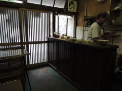 駅でいうと神鉄の丸山が最寄りではあるけど、キツイ坂道だらけなので神戸駅から市バスがおすすめ。丸山バス停で下りて少し先、急坂の途中に年季の入ったお店が見えてくる。 ![]() (左)逆方向から見たところ (右)こんなところにこんな店が! まず、外観に惹かれる。そして出窓状に突出した部分に盛られている天ぷらたちに惹かれる。これは素通りできまいて。 木戸を開けて入るや、断層のようなタイムスリップ現象に見舞われる。 ![]() (左)天ぷらの出窓を内側から (右)低いカウンターの調理場とおやじさん ![]() (左)いぶし銀 (右)床コレモン。カウンター中央が切れて出入口になっている ![]() (左)客席では猫が気持ちよさそ~に寝ている (右)客が来たのでこっちへ移動させられた 60代くらいの夫婦で営まれているようだ。 壁のメニューを見ると、うどん・そば300~500円台、丼物は一番高い上天丼でも630円。そしてひときわ大きく「天ぷら定食530円」と書かれている。 天よしというぐらいだから、それだろう。天ぷら定食と、同行者は天ぷらそばを注文した。 ![]() (左)天ぷら定食530円 (右)この豊かなる漬物ナイス! 天ぷら定食の天ぷらは、いんげんと川津えびとキス。すでに揚げてあったのをポンポンと皿に乗せるパターンだが、530円は安いなー。味噌汁がついてないからだとおやじは言うが、天つゆには大根おろしたっぷりだし、漬物は瓜やら太いきゅうりやらミョウガやら白菜やらいろいろ。 漬物を絶賛したら、茄子の漬物も出してくれた。 ![]() (左)天ぷらそば460円 (右)オマケで出してくれたナスビ漬物 おやじさんの親は花隈にも店を持っていて、この店は昭和29年創業とのこと。 急な坂道の古い店で、おだやかなご夫婦が作る素朴でチープな天ぷら定食をモソモソ食べるひととき。なんと平和なひとときだろう。 クレイジーケンバンドののっさんがこの店が好きで、神戸に来るとよく寄るらしい。 神戸駅前から4または40系統の市バス。“谷底銭湯”として一部銭湯ファンに人気の明泉寺湯に行くときは「大日寺前」で下車するが、そこをやり過ごして2つ先、丸山で下りたら近い。 バス代払ってわざわざ行っても、あとあと余韻に浸れるからオトクともいえる。 (2015年6月) |