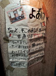 JR鶴橋駅から見てタテの通り3筋目、近鉄より北側。 アーケードの中にひときわ怪しいディープな路地があり、その入り口に電照箱看板が置かれている。 呑み屋なのか食堂なのか判然としないが、その中間的な店なのだろう。 ![]() (左)駅から3分 (右)路地に暖簾がかかっている ![]() (左)呑み屋のノリ (右)カウンターのみの薄べったい店 ガラガラっと開けると、午前11時、ほぼ満席でみな賑やかに呑んでいる。 カウンター内に50歳くらいの夫婦と、カウンターの手前におられるおとなしめのお婆さんとでやっているようだ。 そのお婆さんが席を作ってくださったので、カウンターのいちばん手前の端っこになんとか座った。 腹が減ってるので普通にメシが食いたいけど、カウンター内の上のほうにいっぱい書かれているメニューが遠くてイマイチわからん。 奥のほうのカウンター上に大皿が見えるが、これもよくわからん。店が狭くて見に行くこともできない。 目を凝らしてなんとか見ると、丼もんや麺類500円台~800円、汁物は種類多いが250~300円ほど。あとはいろいろ居酒屋的な一品ものが書かれている。 大衆食堂としては微妙に安くはないが、メニュー豊富で、気安く朝から飲み食いできる人気店という感じだ。 ホルモン炒めが売りきれとのことで、トンテキ750円と小めしを注文。 トンテキ750円しっかりボリュームがあって、デミグラスもなかなかよろし。俺も他客のように酒を頼んで一品ものをいろいろ試してみたかったが、この日はそういうわけにはいかなかった。 合計950円。ちゅーことはめし小200円、やはり呑み屋価格か。もっと安い定食ものもあったのかもしれんけど、なんせ見えん。 帰り際にお婆さんが丁寧に、 「ばたばたしてすんません、これにこりずにまた来てください」 と腰を曲げておっしゃった。 普段はもっと落ち着いてるんかな。まあこんな賑やかな店もよし。また寄ろう。 (2015年3月) |