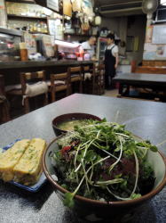 大正駅からヒュッと路地を入ったとこにある。 夜は居酒屋になるようで、外のホワイトボードに魅力的な本日メニューが出されているが、その内容がヘタな海鮮居酒屋顔負けだ。 魚だけでこんだけある!縄のれんをくぐると、愛想のいいおばちゃん二人が迎えてくれる。調理はおっちゃんが担当。 テーブル三つほどとカウンター席だけの小ぢんまりとした店だが、長く続いてきた店独特のゾクゾクするようなオーラが漂っている。 カウンター前にはおかずケースがあり、その中にも外にもいろいろと並んでいる。 壁のメニューを見ると、丼物や麺類など一般的な食堂メニューがリーズナブル料金で揃っている。 がそれより気になるのは、あちこちに貼られている「海鮮丼」「ウニ丼」「イクラ丼」といった海鮮関係の短冊。ここはやはり魚だろう。 いちばん目立つ場所に貼られている「トロ丼700円」を注文した。 するとおばちゃんがカウンター上を示して「野菜ひとつとって~」とおっしゃる。カウンター上には何種類かのおかずを盛り合わせた小皿がいくつも載っていて、この中から好きなのを一つ選ぶ。 選べる「野菜」は茄子煮浸しなどのほか、コロッケ+目玉など全然「野菜」ちゃうやん、これとめしと味噌汁で一食いけるやん級のおかずセットもある。 大きな玉子焼きの「野菜」をもらう。味噌汁と漬物もついてくる。味噌汁にはプリプリのしじみが入っていてこれもお値打ち感あり。 トロ丼にはカイワレの下に生たまごの黄身が潜んでいてユッケになっている。トロ、大量! ワサビ醤油をぶっかけてハガハガ食う。 写真では見えないが漬物もついて700円いやはや、これで700円とは……シャレならん満足感。 夜は居酒屋だが、昼同様に麺類や丼ものもやっている。もちろんトロ丼もあるが、「野菜」と味噌汁はついてないそうだ。 一品ものも安くて品数多し。今度は夜に来よっと。(2016年6月) |