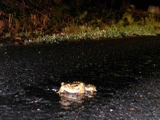 ニホンヒキガエル(ヒキガエル科) 日本固有種です 車に轢かれる覚悟で道路を登って行く姿に すごい殺気を感じます 帰巣本能があり 30年以上生きることもあるとか |