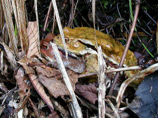 春五月 冬眠からさめて…必死の交尾中 (上がオスです) 鳥取県は 西日本に生きるニホンヒキガエルと 東日本に生きるアズマヒキガエルの 移行地域にあたるのだそうです |