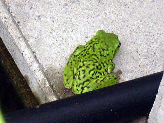 モリアオガエル(アオガエル科) 大人は森で樹に登って暮らしています 指にとても立派な吸盤をもっています 日本の中でも 地域によって体の模様が違うのだとか |