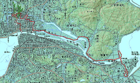 (3)水路をめぐって 城外に出て北へ歩くと、小泉八雲記念館や武家屋敷のある観光地区に出る。日曜日だけあって観光客(ほとんど中高年)がウロウロ歩いている。 デジカメの電池がなくなったが、コンビニなどの場所を誰かに尋ねようにも観光客ばかり。 制服姿に髪を束ねたかわいらしい女子高生が一人、クラブ活動の大きな道具を抱えて歩いていた。しかしこのご時世、俺みたいなオッサンが一人歩きの女子高生に声をかけるような行為は本来控えるべきだろう。でも他におらんので思い切って尋ねた。 すると非常にていねいに2ヶ所のコンビニへの道筋を位置を教えてくれた上で、「私はこっちのコンビニがおすすめです」とニッコリ微笑むではないか。 え、ええ子じゃのぉ〜! そして観光客への温かなホスピタリティー&適切なるアドバイス。これは都会の女子高生にはなかなかできんぞ。松江の株、急上昇。 彼女に教えられたとおりに歩いていると、下写真のような無造作な水路を2本渡った。 そういやこのあたりの水域は、宍道湖・中海・大橋川だけではない。堀川をはじめとする無数の水路が松江の町じゅうを網の目のように走っているのだ。 こんな水路がそこらじゅうにあるで、大橋川に出る前に、松江市内の水路を探索することにした。 といいつついちおう観光コースものぞいた。 ![]() (左)小泉八雲旧居、玄関先の萩が印象的 (右)左手は武家屋敷(入ってない) 明々庵の先の坂を登る北堀橋の近くでまた堀川端に出て、そこから東へウネウネと細い水路端を歩き、バイパス道路の手前で南に折れて別の水路沿いに大橋川へ出た。 ![]() (左)北堀橋付近 (右)水路の分岐点に建つ家 ![]() (左)水路は微妙にずれたり、広くなったり狭くなったりする (右)遊覧船コースの狭い部分 ![]() (左)北田町の水路と古い建物 (右)水路の向こうの空き地に、不自然に立派な松がある ![]() (左)南田町あたり、大橋川が近づくと漁船が増える (右)大橋川に出た。くにびき大橋が見える くにびき大橋の手前に、大橋川コミュニティーセンターというプレハブの建物があった。トイレを我慢していたので、ここでトイレを借りた。 ついでに中を覗くと、ここは大橋川および宍道湖の治水計画を紹介するための施設で、興味深い展示や資料がたくさんあった。でも受付のおばさん以外、お客は誰もいない。 大橋川コミュニティーセンターここで30分ほど、おばさんにいろいろ尋ねながらじっくりと展示物を見学した。 松江は数年前に、大橋川の南側市街地が水没する大きな水害に遭ったらしい。その再発を防ぐために、流入河川上流のダム建設、大橋川の拡幅、堤防の補強などが予定されている。 が、その計画の最大の目玉は、斐伊川の水を宍道湖ではなく、反対の出雲大社側(西側)の日本海へ直接流す水路を建設することだ。むろん洪水時にのみ水門を開けるということらしいが、まるで大反対運動で頓挫した北海道の千歳川放水路計画(洪水時に千歳川を逆流させ、日本海に流れ込んでいる石狩川の水を太平洋に流すという強引な計画)を思わせる大掛かりな計画だ。 この建物内にはその立派なジオラマ模型が展示されていた。 もっとも、俺が好きな古代には、斐伊川の水は宍道湖ではなく今回の計画と同じように、出雲大社付近を通って日本海に流れ込んでいた。それがのちに土砂の堆積などによって流路が変わり、宍道湖へ流れ込むようになったわけだ。 さらにもっと昔は、西側の日本海--宍道湖--中海--東側の日本海はひとつながりの細長い海で、島根半島は島だったらしい。それが次第に本土とつながっていった現象が「出雲の国引き神話」に関係している、と俺はニラんでいるのだが。 大橋川コミュニティーセンターでたくさん資料をあさったおかげで、リュックがかなり重くなってしまった。 センターを出てすぐ東には、くにびき大橋がかかっている。宍道湖から数えて4本目のこの橋が松江市街地での最後の橋であり、この先はいよいよ松江城天守閣から見えた緑のゾーン、大橋川に沿った無人地帯が広がっている。 ![]() 赤線は今回歩いたルート。左が宍道湖、右が中海 俺の持っていた国土地理院の2万5000分の1地形図によると、この先で大橋川は中洲を形成しながら何本かに分流している。 その一つである剣先川に沿って、中洲の中に点線が引かれていた。点線は登山ルートなどの未舗装路を指すことが多い。 その点線をずっとたどっていくと、中洲が終わるところで北側の朝酌川に水門がある。水門を渡ることができれば大橋川の北岸を走る幹線道路に出られるが、そこを渡れるかどうかは地図ではわからなかった。さっきのコミュニティーセンターのおばさんも知らなかった。 もし渡ることができずに中洲の点線を元へ引き返すとなると、かなりの時間と労力をロスすることになる。 賭けだな、これは。 橋のたもとにある「くにびきメッセ」で缶コーヒーを買い、俺は「水門は渡れる」に賭けて、緑のエリアへと侵入していった。 |