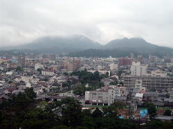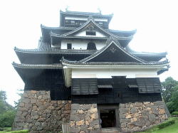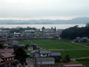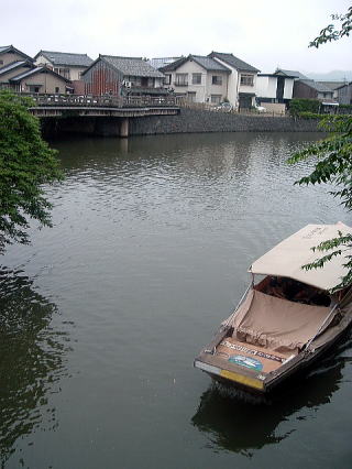 (2)松江城 朝起きたら雨がしとしと降っていた。 前夜、川京で薬剤師オジサンに「神魂(かもす)神社がいいですよ」と強く薦められたので、それのある風土記の丘方面へ行こうと思っていたけど、風土記の丘をレンタサイクルでまわるのはチトきつそうな天気だ。 外へ出てから松江大橋の上でしばらく考えた末に、神魂神社方面はあきらめて、松江城へ行くことにした。 ![]() (左)朝の松江大橋 (右)しゃれた感じの京店商店街 ![]() (左)堀川を行き来する遊覧船 (右)遊覧船乗り場 ![]() (左)歩行者にやさしいリニューアル道路、でも歩行者不在 (右)平山城の松江城が見えてきた 場内に入ると、けっこう観光客がいる。ほとんどは大型観光バスで乗り付けたお客のようだが・・・そうか、今日は日曜日だったのか。 松江城の天守閣は、日本に12しか現存していない木造天守、つまりそのまま武士が使っていたホンモノだ。 ![]() (左)桃山時代から現存 (右)どっしりとした美しさ、別名:千鳥城 ![]() (左)天守閣の中に井戸がある (右)内部は鎧兜の陳列あり、こんな変な兜も 天守閣の最上階はどこもそうだが、夏だろうと雨だろうと、どうしてこんなに気持ちがいいのだろう。 とくに木造現存天守の、古い木の香りに包まれた独特の雰囲気はなんとも言えん。特別なイオンか何かの微粒子でも出てるんじゃなかろうか。 ![]() (左)韓国の大学生(看護学生かも)のグループ (右)南面、宍道湖の眺め ![]() (左)東面に見える嵩山と和久羅山 (右)その少し南に、緑色の区域がある 緑の区域を拡大城から見て南東に、そこだけ緑色の区域がある。あれは宍道湖から中海へと流れていく大橋川の流域だ。 大橋川は時間によって上流から下流へ、下流から上流へと流れを変える奇妙な川だ。洪水で溢れることも多いらしく、その流域は住む人もなく、水田や葦原が広がっているだけのようだ。それでその部分だけが緑色をしているのだが、県庁所在地の市街地に隣接した地区としては異色の存在だろう。 よし決めた。雨もあがったようだし、今日はこれからあそこへ行って、大橋川に沿って中海まで歩くことにしよう。 天守閣を降りて北側にまわると、森を通って北西の搦手之虎口跡に出られる「鎮守の森コース」という小道があった。 そこを歩いていったら、終始誰とも出会わなかった。 ひっそりとした道搦手之虎口跡を過ぎると稲荷橋に出た。堀をめぐる遊覧船が次々にやって来ては橋をくぐってゆく。静かに漕いでいる船頭あり、賑やかに歌っている船頭あり。なかなかおもしろくて、橋の上からずっと見ていても飽きない。 ![]() (左)稲荷橋をくぐる遊覧船 (右)松江城西側の堀を下ってゆく しばらく眺めてから、稲荷橋を渡って城外に出た。 稲荷橋からの堀と遊覧船 |