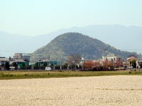 10分たらずの登りで山頂着。152.4m。祠があり、これから向かうこんもりした畝傍山(うねびやま)が西に見える。