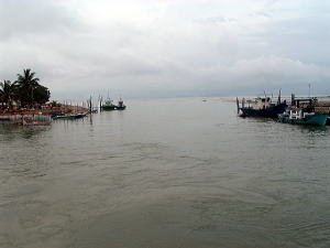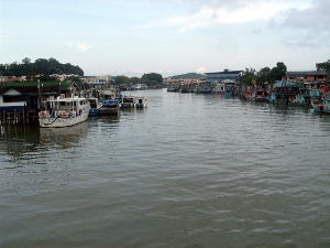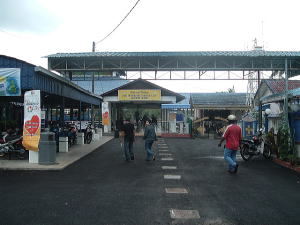 3日目◆シンガポールからティオマン島 朝6時集合のバスに間に合うよう、5時すぎに眠い目をこすりこすり起きた。 そして伍星旅遊のバス発着場まで、暗い中を1.5kmほどタッタカ歩く。朝でも熱帯はやっぱり蒸し暑く、じっとりと汗をかいた。 伍星旅遊には他の客もすでに集まっていたが、カウンターの太ったマレー系の無愛想な女は客を無視してダルそうにパソコンのキーを叩いたり電話したりしている。20分ほど待たされてやっと手続きをした。 しかし店の前の路肩にはたくさんのバスがズラッと並んでいて、メルシン行きのバスはどれなのかサッパリわからない。 そのへんの運転手に聞いて、少し離れた路上に停まっているバスを教えてもらった。俺と丘がバスの横へ行くと、あとから他の客もゾロゾロと集まってきた。中国系カップルが1組と、白人の家族連れやバックパッカーが3〜4組。日本人はいない。 バスのドア前で10分ほど待っていると運転手が来て、乗客をバス内に招き入れた。座席はソファーみたいに豪華だ。 バスはすぐに出発した。 20分かそこらで、マレーシアとの国境、コーズウェイにさしかかった。コーズウェイはシンガポール島とマレー半島の間のジョホール水道にかかる橋・・・のように見えるが、じつは海を埋めて築いた堤防らしい。 なんとシンガポールとユーラシア大陸は地続きだったのだ。 そのコーズウェイを渡るうちに、異変を感じた。なにやらバスが立ち往生して大変なことになっている。 フロントガラスを見ると、前からどんどんバスに向かってマレーシアの車がやってくる。マレーシアの車か、このバスか、どちらかが車線を逆行してるようにしか見えない。こんな光景は生まれて初めて見た。いったいどうなってるんだ? 当然のことながら大渋滞。運転手も必死のようすだが、どうにもできない。 と言いつつ悪戦苦闘の末にどうにかなったらしく、やっとこさ進んでコーズウェイを脱出した。 ちょっと走ったと思ったらバスはまた停車した。そして全員がバスを降りる。シンガポールの出国審査場だった。ここはパスポートだけで簡単に通過する。 建物を出たところにバスが待っていて、また乗り込んだ。少し走ったと思ったら、また停車して全員下車。今度はマレーシアの入国審査場だ。俺はいつものように辞書を引きながら時間をかけて審査カードに記入し、ラストで通過した。 こうして無事にマレーシアに入国した。 外で待っていたバスに三たび乗車し、今度こそメルシンへ向けて走った。 しばらく走ると、イスラム教徒の白いベールをかぶったマレー系の若い女性が俺の横へやってきて、英語で話しかけてくる。俺の今夜の宿はどこかと聞いているようだ。乗客名簿らしいファイルを持っているので、伍星旅遊と契約している現地スタッフなのかな? さすが一人25Sドル(2000円弱)もしたチケットだ・・・。 宿はティオマン島へ上陸してから適当に探そうと思っていた。だからどこも予約していないと言うと、そんな客は珍しいようで、しかも英語もつたない親子を見て、なんとかしてあげなくちゃと思ったようだ。 彼女はいったん俺の横を離れてから、しばらくしてまたやって来て、真剣な顔でメルシンに着いたらドウノコウノ・・・と言う。なにかよくわからなかったが、彼女が非常に真面目そうで、美人で、また控えめで静かな語り口調もよかったので信用してもよかろうと思い、とりあえず「OK, I see.」と言っておいた。 マレーシアにはおもに3種類の人々が住んでいる。人口の1/4を占め経済を牛耳る中国系は自信満々、7%だが商売上手のインド系(ほとんどドラビダ系)は人懐っこいがどこか油断ならない感じ、そして多数派のマレー系は控えめではにかみ屋。そんな性格だからマレー系は中国系とインド系より社会的劣位に立たされている。 でも日本人としてはたぶんマレー系と話すのが一番ラクだろう。ただし彼らはイスラムなので、あくまで表面的な関係においては、だが。 バスの車窓は、延々と続くパームヤシの単調な森だ。これが日本のヤシノミ洗剤なんかになるのだろうか。ジャングルは徹底的に切り開かれ、ほとんど残っていないので景色はすぐに見飽きてしまう。 1回のトイレ休憩を挟み、シンガポールを出てから5時間ほどでメルシンに着いた。 バスを降りると、さっきの若いマレー女性に、別のマレー女性(こんどは太っちょのおばさん)を紹介された。バトンタッチで引き継いだそのおばさんは、俺と丘を乗船場のすぐ近くにある小さな旅行会社のオフィスに連れて行った。 メルシンの乗船場、真新しくて立派このおばさんもさっきの若い女性同様、日本人的な気配りをする、感じのいい人物だった。 おばさんはティオマン島の各地を紹介するファイルを見せ、ティオマン島のどこへ行きたいのかと聞く。俺は「ムクッという村に行きたい」と言った。そこがイヤーズ・オブ・ドラゴンにいちばん近いからだ。 しかしおばさんは、「ムクッはストーンビー