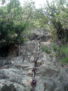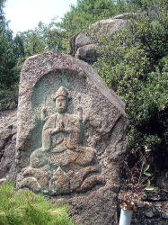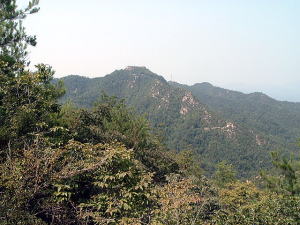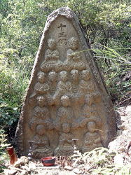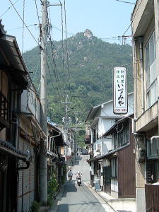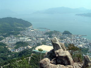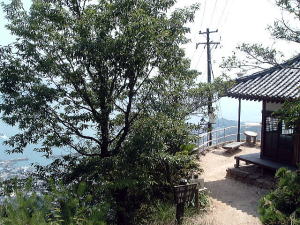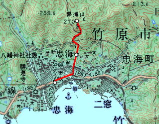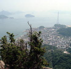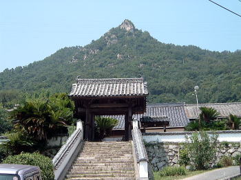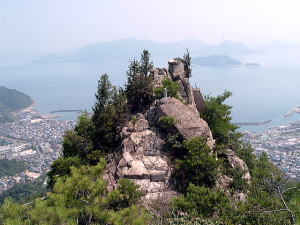 | 瀬戸内ののどかな海沿いを走る呉線「忠海(ただのうみ)」駅の背後に立ちはだかる山。低いけど、この個性的な姿は一度見たら忘れられない。 なんせ、てっぺんに爪が生えています。あれはどうなっているんだろう。 駅を出ると、「黒滝山→」の立派な案内板が出ている。これに従って行くとさらに要所要所に案内板があり、迷うことなく取り付ける。 のどかな((左)赤線は歩いたルート (右)港町の守護神駅から1.5kmほどで冒頭写真の地蔵院に着く。ここが登山口になる。寺の裏の墓場を抜け、山道に入ると、西国三十三霊場を表す石仏が次々と現われる。 けっこうほのぼのします登山道は風化の進んだ明るい道で、須磨あたりの六甲山に酷似している。登るに連れて瀬戸内の素晴らしい風景が南側いっぱいに広がり、「乃木将軍の腰掛け岩」とか「平山郁夫がスケッチした場所」などがあって退屈しない。 またこの道は地元の体力づくりコースか何かに使われているらしく、あちこちに「ここで垂直飛び〇回」とか「腹筋〇回」などと書かれたポイントがある。しかしせっかく眺めのいい東屋に「休憩(5分)」なんて書かれてあると、なんだかゆっくりくつろげない。俺も小心者だな。 ![]() (左)爪部分を横から見たところ。爪の生え際には観音堂がある (右)観音堂 ほどなく爪の根元にある観音堂に着く。ここから山道は爪の背後にぐるっと迂回して頂上に至るが、鉄の鎖にすがって爪の右サイドを直登することも可能。せっかくなので鎖コースを登る。 鎖場鎖を上りきった岩塔からは、すばらしい風景が広がる。忠海の東西二つの港がすっぽり見える。正面には大三島が横たわり、その間に浮かぶ大久野島は戦時中「毒ガス製造工場」があった島だ。 ここまで地蔵堂からわずか30分ちょっとだった。 ![]() ![]() 連続写真、中央部ややズレてます 後ろ(北)を見ると、もう一つ岩塔がある。そっちが頂上かと思って移動したら、さらに北側にもひとつピークがある。そこが本当の頂上で、迂回路が合流している。 ![]() (左)第2のピークから、最初のピークごしの瀬戸内風景 (右)黒滝山の北にある白滝山 頂上には日陰もあまりなく、カンカン照りで暑くてたまらない。登山道はここから北の白滝山へと続いているが、とにかく暑いしチャッチャと下りる。下りは地蔵堂までアッっちゅーまの15分だった。 ![]() (左)地蔵堂から。老人が道に出てじっと海を見ていた (右)病院の看板も山のかたち というわけで黒滝山は、わずかな時間で手軽に登れて眺めもいい、地元に愛されるキュートな山だ。 (05.7.22) |
