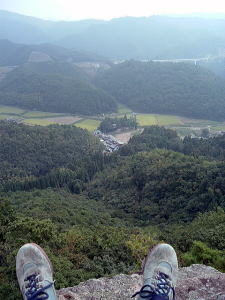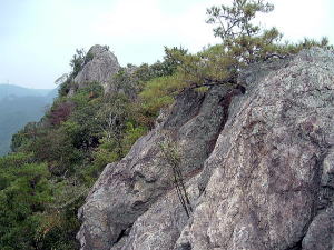 | 「 { 」をパタッと横に伏せた形。 問題はその先端部、思わずつまんでしまいたくなるポッチリの正体だ。 1/25000地形図に山名は載っていないが、上写真の向かって右の肩部分に278.1mの三角点がある。ポッチリはそれより高そうなので、280mを超えているもよう。 この日は友人といっしょに車で楽々アプローチ。相生市北部、播磨科学公園都市に向かう道路(通称テクノライン)を北上すると、右手の山の上に岩場が飛び出ているのが見える。 能下集落でテクノラインを外れ、集落内の山際にある八幡神社から歩く。相生駅からバスなら「能下」で降りてすぐ。 能下(山の北西)からポッチリ拡大 ![]() (左)能下の手前(山の南西)の道路から。左がポッチリ、右の高く見えるのは右肩ピーク (右)ポッチリ拡大 神社の右手に続く地道を歩くとやがて山道になり(マムシ出た〜)、数分で峠に至る。そのまま進むと道は山の東側にある榊集落へ下ってしまうので、ここで道を離れて右の尾根に取り付く。 尾根には明確な道はないが、たいへんさわやかな森。下草もまったくなくゴキゲンな散歩を楽しめる。 ![]() (左)きわめて歩きやすい尾根 (右)ヤマモモの巨木があったりする やがて徐々に傾斜が急になり、同時に進路のあちこちに露岩が現われる。でもしっかりした踏み跡があり、尾根をたどれば問題はない。無名の山のわりにけっこう歩かれているみたい。 15分もしないうちに、ポッチリの真下に到着。 ジャーン、これがポッチリポッチリ征服はすべての男の夢だ。さっそくむしゃぶりつく。 左側は断崖だが、右側からまわりこめば素手でわりと簡単に登れる。岩肌もしっかり丈夫で、なかなか楽しい。 ポッチリの頂上は2〜3人サイズ。360度さえぎるものなんかあるわけない、パーフェクトなる展望が開ける。下から吹いてくる風がなんとも気持ちよろすい。人跡にまったく汚されてないのもいいねぇ。 南に三角点のある右肩ピークがあるが、おんやぁ〜、その右後方に見える権現山も・・・男の夢系の気になる形じゃありませんか! ![]() (左)頂上から南。正面は右肩ピーク、そこへの途中に2ヶ所の露岩あり(左端)。で、右後方の権現山はモロに・・・ (右)南西方向、3〜4枚目の写真を撮ったあたりを逆に見下ろす ![]() (左)東の方角、榊集落 (右)北西、能下を遠望。あそこからここまで20分たらずとは・・・足は偉大なり しかしまあ、あっという間に着いてしまったな。ちょっと拍子抜け。せっかくだし右肩ピークへも行ってみるか。 ポッチリから元の地点に下り、東側の断崖下を巻いて南側へと回る。 うひゃー、こっちから見ると、まるで中国の仙山のようにそそり立っているな。東西両面が包丁でぶった切ったみたい。 ![]() (左)東の絶壁 (右)南側から見たポッチリは大変りりしい そこから南へは2ヶ所のテーブル状の露岩を順に通る。それを過ぎるとヤブっぽくなり、枝をかきわけて右肩ピークの三角点を発見。 でもここはたいして展望もなくつまらない。この先、権現山へはますますヤブが濃そうだったので、ここで引き返した。 ![]() (左)2番目の露岩からポッチリを見る (右)右肩ピークの三角点 途中のテーブル状露岩でおにぎりを食べ、ゆっくりくつろいでから来た道を能下へ戻る。 はるばる来たわりにはやや歩き足りない感もあるが、さわやかな尾根の森とプチスリルな岩登り、最高の展望と、山歩きの楽しさがこれほどコンパクトにギュッと詰まった山はそうないかもね。 なにより、六甲山と違って誰もいないのがよろしい。素敵な秘密のふしぎ山だ。 (05.9.3) ![]() (左)能下の八幡神社 (右)拝殿には絵がいっぱい飾られている |