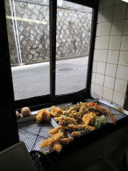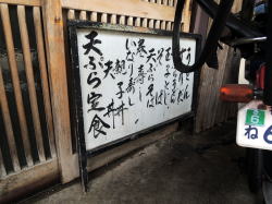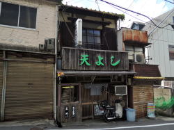 駅でいうと神鉄の丸山が最寄りではあるけど、キツイ坂道だらけなので神戸駅から市バスがおすすめ。丸山バス停で下りて少し先、急坂の途中に年季の入ったお店が見えてくる。 ![]() (左)逆方向から見たところ (右)こんなところにこんな店が! まず、外観に惹かれる。そして出窓状に突出した部分に盛られている天ぷらたちに惹かれる。これは素通りできまいて。 木戸を開けて入るや、断層のようなタイムスリップ現象に見舞われる。 ![]() (左)天ぷらの出窓を内側から (右)低いカウンターの調理場とおやじさん ![]() (左)いぶし銀 (右)床コレモン。カウンター中央が切れて出入口になっている ![]() (左)客席では猫が気持ちよさそ~に寝ている (右)客が来たのでこっちへ移動させられた 60代くらいの夫婦で営まれているようだ。 壁のメニューを見ると、うどん・そば300~500円台、丼物は一番高い上天丼でも630円。そしてひときわ大きく「天ぷら定食530円」と書かれている。 天よしというぐらいだから、それだろう。天ぷら定食と、同行者は天ぷらそばを注文した。 ![]() (左)天ぷら定食530円 (右)この豊かなる漬物ナイス! 天ぷら定食の天ぷらは、いんげんと川津えびとキス。すでに揚げてあったのをポンポンと皿に乗せるパターンだが、530円は安いなー。味噌汁がついてないからだとおやじは言うが、天つゆには大根おろしたっぷりだし、漬物は瓜やら太いきゅうりやらミョウガやら白菜やらいろいろ。 漬物を絶賛したら、茄子の漬物も出してくれた。 ![]() (左)天ぷらそば460円 (右)オマケで出してくれたナスビ漬物 おやじさんの親は花隈にも店を持っていて、この店は昭和29年創業とのこと。 急な坂道の古い店で、おだやかなご夫婦が作る素朴でチープな天ぷら定食をモソモソ食べるひととき。なんと平和なひとときだろう。 クレイジーケンバンドののっさんがこの店が好きで、神戸に来るとよく寄るらしい。 神戸駅前から4または40系統の市バス。“谷底銭湯”として一部銭湯ファンに人気の明泉寺湯に行くときは「大日寺前」で下車するが、そこをやり過ごして2つ先、丸山で下りたら近い。 バス代払ってわざわざ行っても、あとあと余韻に浸れるからオトクともいえる。 (2015年6月) |