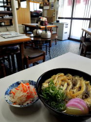 ランチも過ぎて中途半端な時間の肥後橋。 ビジネス街をクイッと入った街角に、めっちゃエー感じの食堂があるやんか。一目見てニヤケる顔、高鳴る胸、グゥ鳴る胃。 ![]() (左)こんなところにヒョイっと (右)店内も最高 暖簾をくぐるとああ、これぞ俺の心を平安に導く麗しの風景だ。厨房窓口のところには木製おかずケースもあるではないか! 壁のメニュー見たら、うどん・そば300円から、丼物500円から、焼きそば・焼飯・チキンライス・ドライカレー500円、オムラ600円、みな安い。中華そばはないけど、小うどん小そば200円もあるぞ。めし小160円、味噌汁100円。いいねー。 高齢のおやじさんにきざみそば400円を所望して、しばし待つ。 いやーもう、ここにいるだけで落ち着くねぇ。なんやろねぇ。 やがてやってきたきざみそばの美しさよ。おや?、なます酢の物がついてきた。 「いつもこれが付いてくるんですか?」 するとおっちゃんは笑って、 「いやいや、これがちょっと残ったから」 とサービスしてくれたらしい。 いい!なます、たっぷりあって、うまい! 感激。 しみじみ味わう、きざみそば。うまい! 食い終わったらそのへんの新聞を広げ、午後の贅沢なひとときを送る。この店には銭湯の風呂上がりの脱衣場と同系統のやすらぎオーラが漂っておるではないか。 もういっそ、この店に住みたい。 (2015年10月) |