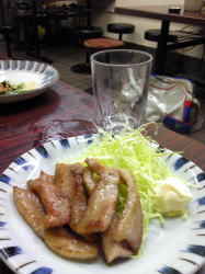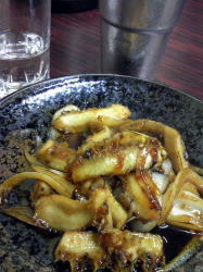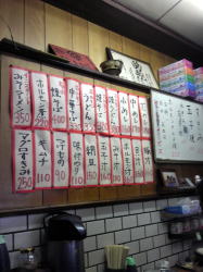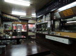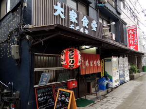 新今宮駅から南側の道を挟んだ、いわゆるあいりん地区。 同じ並びには名店として知られる「焼肉の大寅」がある。同名だから関係があるのかもしれないが確認していない。 入ってすぐ右手におかずケースあり。こぢんまりとした店内は4人がけテーブルが5つあるが、一つは新聞などの置き場になっている。 厨房では男手が働き、ホールはわりと若いおねーさんが担当している。 普通、作り置きの料理は1人前ずつ皿に分けられているものだが、ここは厨房の手前の床にホルモン系の煮込み料理などが入ったズンドウがいくつかと、その上には惣菜の大皿が何枚も置かれていて、それらを分けてもらうこともできる。ディープな光景だ。 壁に貼られたメニューは定番もののほか、ホルモン類をはじめとする一品ものが充実していて、飲み屋としてもよい。どれもこれも安くてうまい。 ![]() (左)トントロ300円 (中)ニラ玉ベーコン300円 (右)ハチノス炒め400円 生ビール中は380円。ここもまた、やみつきになりそうな濃い~店だ。 ただし場所柄、慣れない女性が一人で食べに行くのは無理がある。 (2015年2月) |