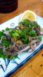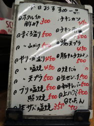 西天下茶屋駅のほうから西天商店街を南下すると、アーケードが二股に分かれる。それを右(南本通り商店街)へとるとすぐにこの店がある。 店の前に焼き鳥焼き器があり、夕方5時を過ぎるとここでオネーチャンが朝ジメ鶏を焼き始め、周囲にいい香りをまき散らす。 構えはけっこうディープだが、店の前に定食メニュー(650~800円)やおすすめが表示されていて入りやすい。 店内は カウンター6~7席と小上がり3卓。こぢんまりとしているが、この店の魅力はメニューの多さだ。 うどん、そば、ラーメン、丼物、定食ものなどの食堂定番メニューに加えて、一品ものの充実っぷりは並の居酒屋と比べてもまったくひけをとらない。 ![]() (左)定番もの、和風カレーラーメン気になる (右)本日もの、刺身もいろいろ 生ビール400円だが、17~20時は350円。 焼酎水割りも濃い目でよい。つき出しに小さな冷奴がついてくる。 周辺には銭湯が多いので、風呂上がりの一杯にちょうどよろし。 ![]() (左)ささみユッケ350円 (中)生センマイ500円 (右)表で焼いてもろた焼き鳥200円台 腰の低い50くらいの男性と、その嫁はんらしき人と、厚化粧の若いバイト女性がやっている。 表には「夜10時まで」と書かれているが、店内には「翌2:00まで」とある。なんちゅー長い営業時間や。 ずーっとやってて、安くてメニュー豊富で、客も小さな子連れの家族もいればおっさんコンビもいる、なんか嬉しくなる穴場店だ。 寄って帰らな損!(2016年3月) |