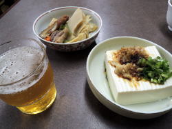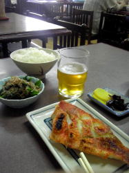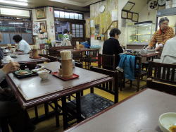 花園町の交差点から5分もかからんくらい。ええ感じの下町の四つ角にあって、このあたりをぶらついているといつも通りかかる。 店内はテーブルが8卓くらいある。客層はおおむね中高年だが、女性客がけっこう多いのが特徴的だ。昼飯どき夕飯どきはよく繁盛している。 壁のメニューは麺類400~500円台、丼物や洋食500~600円台。ビール大瓶500円はありがたいが、ハムエッグもなぜか500円! 注文する勇気が出えへんな…。 しかしこの店の魅力は、なんといっても3台もあるおかずケースだ。 ![]() (左)明るい店内 (右)冷奴150円、たけのこ煮300円で居酒屋づかい 別の日の昼飯、アカウオ300円、ほうれん草200円、めし小150円2階に店主家族が3世代で住んでいるのか、夕方に行くとたいてい大将の孫(小学生)が階段から下りてきて、客が晩飯を食っている後ろで思いっきり家族の会話が繰り広げられる。 客も家族もいっしょくたに団らんする、昔の賑やかな下町食堂だ。 (2015年4月) |