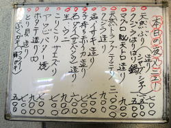 大正駅からヒュッと路地を入ったとこにある。 夜は居酒屋になるようで、外のホワイトボードに魅力的な本日メニューが出されているが、その内容がヘタな海鮮居酒屋顔負けだ。 魚だけでこんだけある!縄のれんをくぐると、愛想のいいおばちゃん二人が迎えてくれる。調理はおっちゃんが担当。 テーブル三つほどとカウンター席だけの小ぢんまりとした店だが、長く続いてきた店独特のゾクゾクするようなオーラが漂っている。 カウンター前にはおかずケースがあり、その中にも外にもいろいろと並んでいる。 壁のメニューを見ると、丼物や麺類など一般的な食堂メニューがリーズナブル料金で揃っている。 がそれより気になるのは、あちこちに貼られている「海鮮丼」「ウニ丼」「イクラ丼」といった海鮮関係の短冊。ここはやはり魚だろう。 いちばん目立つ場所に貼られている「トロ丼700円」を注文した。 するとおばちゃんがカウンター上を示して「野菜ひとつとって~」とおっしゃる。カウンター上には何種類かのおかずを盛り合わせた小皿がいくつも載っていて、この中から好きなのを一つ選ぶ。 選べる「野菜」は茄子煮浸しなどのほか、コロッケ+目玉など全然「野菜」ちゃうやん、これとめしと味噌汁で一食いけるやん級のおかずセットもある。 大きな玉子焼きの「野菜」をもらう。味噌汁と漬物もついてくる。味噌汁にはプリプリのしじみが入っていてこれもお値打ち感あり。 トロ丼にはカイワレの下に生たまごの黄身が潜んでいてユッケになっている。トロ、大量! ワサビ醤油をぶっかけてハガハガ食う。 写真では見えないが漬物もついて700円いやはや、これで700円とは……シャレならん満足感。 夜は居酒屋だが、昼同様に麺類や丼ものもやっている。もちろんトロ丼もあるが、「野菜」と味噌汁はついてないそうだ。 一品ものも安くて品数多し。今度は夜に来よっと。(2016年6月) |