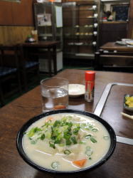 大正駅を出て信号を渡ってすぐ。宮本むなしの1軒おいて隣でがんばってます! 店内はこぢんまりとして、4人がけテーブル3つ、2人がけ3つ。奥におかずケースあり。 ![]() (左)落ち着いた空間 (右)おかずケースのキャベツ炒めチン300円、量たっぷり この手の食堂にしては若くて、感じのいい女性が一人でやっている。焼酎お湯割り(300円)を頼んだら梅干しをつけてくれた。嬉しい! 壁のお品書きは、麺類200~500円台、丼物400~600円台と値段に幅があり、懐具合と相談できる。 小さな食堂のわりに、定番もの以外のメニュー「肉鍋 770円」「キムチ鍋 670円」「麻婆豆腐 520円」「豚キムチ 470円」「雑煮(みそ、すまし)350円」などもあって、ちょっと興奮だ。 ![]() (左)豚キムチ470円、ウンマー! (右)粕汁250円もたっぷり ビール大瓶480円、生中400円も良心的。 正直言って隣の宮本むなしのほうが賑わっているが、俺的には比べるまでもなくいろんな意味でこっちが断然ナイスだ。ぜひよしのやへ! (2015年2月) |