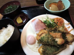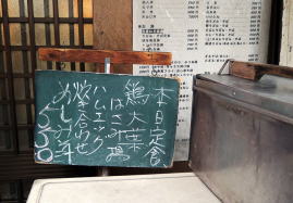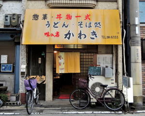 阪急三国駅から東へ7~8分歩いたあたり、昭和40年代にドッと建てられた的な隣家密着型の1階店舗2階住居建築が並ぶ。 そのひとつに黄色テントがかかり、変わった屋号が書かれている。どんな漢字を書くのだろう。「川喜」という料亭などもあるが、それよりここはなんとなく「以前クリーニング屋でしてん」な感じやなー。 ![]() (左)こういう並びの食堂も減った (右)おっと、そそられる! 表に出された小さな黒板に、その日の定食が書かれている。「鶏大葉はさみ揚にハムエッグ…」決まりやな。 中に入るとカウンター3、テーブル3の小さなお店。 壁の短冊メニューを見たら、うどん・そば350円~450円あたり、丼物は500円前後、ほかに一品ものが冷奴150円、だし巻き200円、ハムエッグ250円などいろいろ。一般的良心的な大衆食堂料金だ。 ともかく表に出てた「本日の定食」をもらおう。 ![]() (左)小さな店 (右)本日定食550円 おかーちゃんが作り、おとーちゃんが運ぶ。どちらもたいへん感じよし。 やってきた定食、うまいわ~。これで550円は文句なし。 向かいの席では学生ぽいニーチャンが一人で晩飯を食っている。 近所にあれば俺も週に何度かは昼飯または晩飯を食いに来るであろう。 (2015年6月) |
