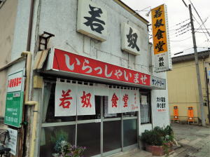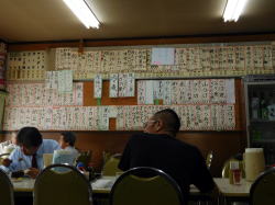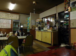 身延線金手(かねんて)駅から徒歩5分ちょい。 両側の建物がなくポツンと建っている。 ちょっと心配…若奴食堂はもう1軒あるらしく、こちらは「中央店」となっている。 中に入ると、午後2時前という中途半端な時間にもかかわらず、けっこう客がいる。 決して広い店ではない。中央に8人がけ大テーブル2つ縦列、左に小テーブルが2、3並び、右に小あがり3卓。テーブルがけっこう混んでるので小あがりに上がった。 とにもかくにも、壁を埋め尽くすメニューが圧倒的ですばらしい。麺類・丼物に始まって、一品ものの豊富な種類がもうコレでどや級。いちいち書けない。なんかジーンとくるよ。 ![]() (左)これはすごい! (右)厨房方面 客の多くがボリュームのあるカレーらしきものを食っている。壁に、 「日替わり かつカレー スープつき 750円」 と書かれている。かつカレーは通常1000円、そりゃ皆頼むわな。 そして店のおばちゃんの威勢がよく、見ていて気持ちがよい。 暑いから、まずはビール頼も。アサヒ・キリン・サッポロどれも大瓶550円、これだけでこの店の優良度がワカルよね。つきだしのモヤシナムルも嬉しい。 卓に置かれているメニューを見ると、地酒もいろいろあるぞ。ワインも山梨県産と輸入物とがある。焼酎やサワー系も細かくナントカ割が設定されていて、どんな要求にも応えようという姿勢に感服する。 目移りして苦しんだ末に、ベーコンエッグ550円。ベーコンのボリュームが嬉しい。 ほんで冷奴。あかん、メニューが充実しすぎてると結局こうなってまう。 ![]() (左)ベーコンエッグ550円 (右)紙カツ550円 「紙カツ550円」というメニューが貼られていたので「あれは何ですか」と聞くと、「トンカツより肉の薄いカツだけど、そんなには薄くないですよ」とおばちゃんが言う。 で、それも注文。たしかに薄いけど、それほど薄くはない。「紙」でこれなら十分だ。 そして自家製漬け物、味の素かけ。ウリうまし。 ![]() (左)小上がり (右)漬物 帰るのが嫌になる名食堂だ。近所にあったら俺はここで毎日三食こなしてヌシ化することは間違いない。 (2017年8月) |