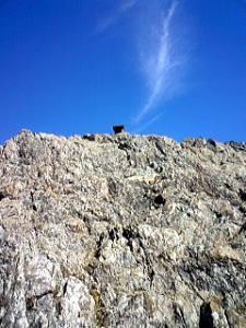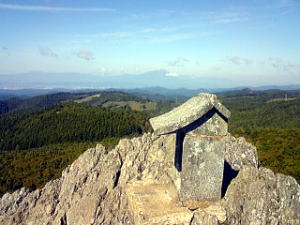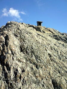 なんやねんこのJR山田線っちゅーのは。本数が少なすぎて、せっかくの乗り放題切符も使えやしない。 仕方がないので朝7時半、宮古駅前から盛岡行きのバスに乗った。 閉伊川という美しい川に沿う国道を1時間以上も山奥へと走るうち、バスは北上川水系との分水嶺付近に到達する。このあたりは区境(くさかい)高原と呼ばれていて、広々した風景が広がっているが・・・おっとぉ、右前方に否応なくターゲット発見! 高原のユルーイ斜面の上に、ちょびっとだけピュンってとんがったものが立っとるぞ。ははは、これは目立つわ。 午前9時、区境バス停で下車。正面に道の駅があり、その後ろに登山コースを示す看板が立っているので、それに従って歩き出した。 目の前に目指す兜明神岳が鎮座している。なんといってもそのユルイ傾斜と、頂上部だけピュンと立ち上がった姿が愛らしい。あそこ、どうしたってキュっとつまんでやりたくなるよねぇ。ならんか? ![]() (左)なんとなく世界の中心点を感じる (右)拡大、てっぺんは傾斜のある岩場になっているらしい 青空広がる秋の高原を、さわやかな風が渡ってゆく。ああもう俺、いい人に生まれ変わっちゃうよ。 口笛吹き吹き、山に向かって畑の中を歩いていると、数分で「区境高原ウォーキングセンター」という立派なレクリエーション基地に出た。兜明神岳はここでの「ウォーキング」のメインに位置づけられているようだ。ということは今回は道標完備の楽ちんハイキング、いやウォーキングね。 道はそこから森に入る。美しいなぁ。関西の照葉樹林とは根本的に異なる清々しさ。 ![]() (左)カラマツ、かな? (右)ミズナラやシラカバの森の中、よく整備された登山道 ![]() (左)登るにつれダケカンバが増える。気分ますます爽快 (右)切り開かれたところへ出た スキー場跡のような切り開きを抜けて再び森へ入る。と、しばらくしてまた広々とした大きな広場に出た。山小屋や炊事場のような施設がある。道の駅から40分くらい。 山小屋を見に行ってフト振り返ると、森の向こうに兜明神岳の山頂部岩塔がひょっこり見えた。 広場から再び森に入り、じくじくしたところを過ぎると、いよいよ岩が現れ始める。 ![]() (左)山小屋の前から見えた山頂部 (右)森の中に現れた岩場 ![]() (左)森はここで終わり (右)これまでと一転して、ガチガチの岩場になった ここが「ちょっとだけピュン」の山頂岩場部分だな。 岩はしっかりしていてホールドがたくさんある。登りやすそうなところを適当によじ登ってゆくと、岩場の中ほどに祠が一つあり、さらに頂上にも祠が見えた。 ![]() (左)岩場を見上げたところ (右)あそこが頂上だ! 岩場に取り付いてわずか1〜2分で頂上に着いた。ただし高所恐怖症の人にはちょっとキビシイかも。山小屋の広場からも10分足らずだった。 山頂の岩はデコボコで足場が悪く、風もあるし周囲が切れ落ちているしで、怖くて立ち上がれない。滞在は2人が限度だろう。 だが麓からの予想通り、360度のパーフェクトパノラマが全視界を埋め尽くす。 ![]() (左)山頂の祠から西を見ると・・・遠くの山は? (右)拡大、岩手山だ! 初めて見たぞ ![]() (左)登ってきた区境高原方面 (右)東には北上山地の最高峰、早池峰山がゆったりと横たわる ![]() (左)北にはまーるい岩神山 (右)登ってきた斜面を見下ろす ちょっとだけピュン、の岩場部分を包み込む周囲の天然林の美しさがたまらない。紅葉にはまだ少し早いが、半月後くらいにはもうどうしようもなく美しくなるのだろう。 岩にもたれて、周囲の景色を眺めながらパンを食ってコーヒーを飲んだ。これ以上の幸福なんて、さしあたって思いつかないな。 30分ほどくつろいで、頂上をあとにした。 岩場を降りる途中、振り返ったらフシギな雲が出ていた下りは道を変えて、真北の兜神社方面へ。森の中をどんどん下って、30分ほどで神社に着いた。兜明神岳がご神体なのだろうが、まあ何の変哲もない神社だ。 神社のすぐ先は国道だが、国道を歩くのは嫌なので、その手前の小さな川のほとりを歩いて道の駅まで戻った。 兜神社の鳥居から山を振り返る簡単すぎて登り応え的にはちょっと物足りないが、森の美しさと高原ののびのび感、そしてプチスリルの岩場と最高の展望をお手軽に楽しめる点ではかなりなスグレモノだ。 デートに使えるフシギ山として幅広く推薦したい。 (05.12.11) |