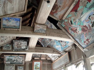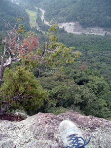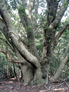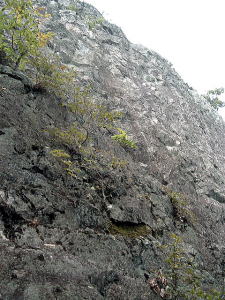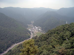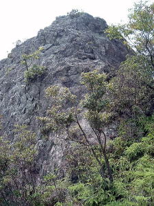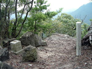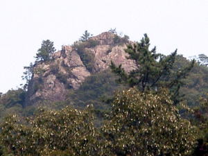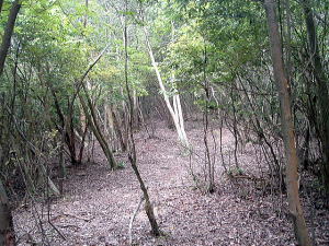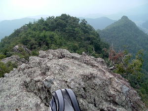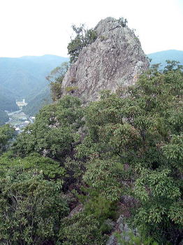 | 「 { 」をパタッと横に伏せた形。 問題はその先端部、思わずつまんでしまいたくなるポッチリの正体だ。 1/25000地形図に山名は載っていないが、上写真の向かって右の肩部分に278.1mの三角点がある。ポッチリはそれより高そうなので、280mを超えているもよう。 この日は友人といっしょに車で楽々アプローチ。相生市北部、播磨科学公園都市に向かう道路(通称テクノライン)を北上すると、右手の山の上に岩場が飛び出ているのが見える。 能下集落でテクノラインを外れ、集落内の山際にある八幡神社から歩く。相生駅からバスなら「能下」で降りてすぐ。 能下(山の北西)からポッチリ拡大 ![]() (左)能下の手前(山の南西)の道路から。左がポッチリ、右の高く見えるのは右肩ピーク (右)ポッチリ拡大 神社の右手に続く地道を歩くとやがて山道になり(マムシ出た〜)、数分で峠に至る。そのまま進むと道は山の東側にある榊集落へ下ってしまうので、ここで道を離れて右の尾根に取り付く。 尾根には明確な道はないが、たいへんさわやかな森。下草もまったくなくゴキゲンな散歩を楽しめる。 ![]() (左)きわめて歩きやすい尾根 (右)ヤマモモの巨木があったりする やがて徐々に傾斜が急になり、同時に進路のあちこちに露岩が現われる。でもしっかりした踏み跡があり、尾根をたどれば問題はない。無名の山のわりにけっこう歩かれているみたい。 15分もしないうちに、ポッチリの真下に到着。 ジャーン、これがポッチリポッチリ征服はすべての男の夢だ。さっそくむしゃぶりつく。 左側は断崖だが、右側からまわりこめば素手でわりと簡単に登れる。岩肌もしっかり丈夫で、なかなか楽しい。 ポッチリの頂上は2〜3人サイズ。360度さえぎるものなんかあるわけない、パーフェクトなる展望が開ける。下から吹いてくる風がなんとも気持ちよろすい。人跡にまったく汚されてないのもいいねぇ。 南に三角点のある右肩ピークがあるが、おんやぁ〜、その右後方に見える権現山も・・・男の夢系の気になる形じゃありませんか! ![]() (左)頂上から南。正面は右肩ピーク、そこへの途中に2ヶ所の露岩あり(左端)。で、右後方の権現山はモロに・・・ (右)南西方向、3〜4枚目の写真を撮ったあたりを逆に見下ろす ![]() (左)東の方角、榊集落 (右)北西、能下を遠望。あそこからここまで20分たらずとは・・・足は偉大なり しかしまあ、あっという間に着いてしまったな。ちょっと拍子抜け。せっかくだし右肩ピークへも行ってみるか。 ポッチリから元の地点に下り、東側の断崖下を巻いて南側へと回る。 うひゃー、こっちから見ると、まるで中国の仙山のようにそそり立っているな。東西両面が包丁でぶった切ったみたい。 ![]() (左)東の絶壁 (右)南側から見たポッチリは大変りりしい そこから南へは2ヶ所のテーブル状の露岩を順に通る。それを過ぎるとヤブっぽくなり、枝をかきわけて右肩ピークの三角点を発見。 でもここはたいして展望もなくつまらない。この先、権現山へはますますヤブが濃そうだったので、ここで引き返した。 ![]() (左)2番目の露岩からポッチリを見る (右)右肩ピークの三角点 途中のテーブル状露岩でおにぎりを食べ、ゆっくりくつろいでから来た道を能下へ戻る。 はるばる来たわりにはやや歩き足りない感もあるが、さわやかな尾根の森とプチスリルな岩登り、最高の展望と、山歩きの楽しさがこれほどコンパクトにギュッと詰まった山はそうないかもね。 なにより、六甲山と違って誰もいないのがよろしい。素敵な秘密のふしぎ山だ。 (05.9.3) ![]() (左)能下の八幡神社 (右)拝殿には絵がいっぱい飾られている |