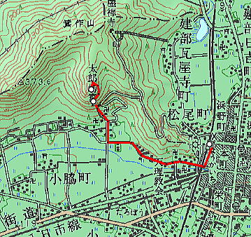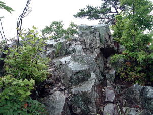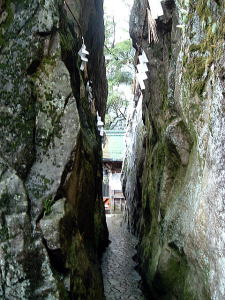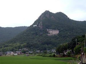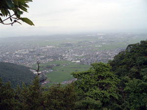 | 琵琶湖の東に太郎坊なる岩ゴツゴツの霊山があるっちゅー話。ハテ、三上山は有名だが太郎坊なんてあったかいな〜と思いつつ、滋賀での仕事帰りに寄ってみた。 近江鉄道の八日市駅から西へ1.5kmほど行くと、上写真の鳥居前に至る。 おおー、こりゃすごい。標高は350メートルぽっちだが、この見栄えのよさは只者じゃないな。 この山は太郎坊宮(阿賀神社)のご神体で、赤神山とも呼ばれる。太郎坊とは鞍馬の次郎坊天狗の兄らしいが、まさにその謂れのごとく、むき出しの大岩と急傾斜のそそり立ちっぷりが周囲を圧する存在感を放っている。神体山信仰の発祥の地とされるのもうなずけるところ。 ちなみに近江鉄道の太郎坊前駅からのほうが近そう。駅から北へ徒歩10分ほど。 ![]() (左)山頂部アップ。左にへばりつく白い四角が修復中の本殿 (右)そこまでは石段760段。うひゃひゃ〜 上左写真の右端に見えている大きな建物は参集殿で、ここまでは車で上がることが可能。そしたら石段登りはちょびっとですむ。 石段を上るにつれて巨岩怪石が現われる。阿賀神社の祭神はオシホミミだが、そこに天台山岳信仰と修験道が習合して、怪しくも濃厚かつディープな気配をただよわせている。 ![]() (左)登りきったところに鳥居 (右)その奥に「夫婦岩」と呼ばれる、二つに割れた巨岩がある 本殿はこの夫婦岩の奥にある。お参りするにはこのパックリ割れた狭いスキマを通らねばならないが、ウソつきが通ると岩が閉じてつぶされるんだと。 俺は胸を張って堂々と通ってやった。何事も起こらない。当たり前だ。太郎坊のウソつき野郎め。 しかしまあ、よくこんなところに建てたなぁ。 修復中の本殿本殿前からは蒲生野を一望できる素晴らしい眺め。この日は雨が降っていたが、我慢できずに、さらなる眺望を求めて山頂まで行ってみた。 本殿の上は覆いかぶさるような巨岩で、修験者の行場なのか岩盤に古い金具なんかが見えているが、とてもじゃないが常人には登れそうにない。 山頂への道は、石段を少し降りたところにある御手洗場の横からついている。 ここに道標はないが、山道に入ると現われる登山道は正面岩山の東側を迂回し、北(箕作山)からの縦走路と合流して背後から登頂するかたちになる。正面から見たら三角形に切り立った独立峰のようだが、じつは背後は北の箕作山と尾根続きになっている。神体山のため登山道の脇にはロープが張られ、「止め山」と書かれた紙があちこちに下げられている。 靴がずぶ濡れになるのもかまわず傘を盾にしてガンガン歩くと、さしたる岩場もなくわずか15分ほどで山頂に出た。ご神体とは知りながらも生理現象には勝てず、傘をさしたまま立小便してオニギリ食った。 ここで気づくのだが、正面から山頂のように見えていたピークは実は山頂ではなく、到達した真の山頂はその背後に隠れていたのだった。正面ピークへは道がない。 山頂からは360度の空中写真のごときシャイコーの展望だ。山のせり上がり角度が急なため、すばらしい高度感。まさに天狗にでもなったような気分じゃのう、クワックワックワッ。 ![]() (左)山頂はゴツゴツした岩場 (右)雨にけぶる蒲生野、天気がよければどこまで見えることやら 木の枝に傘を引っ張られながら、来た道を戻って夫婦岩まで降り、さらに760階段を降りて冒頭写真の鳥居へ戻る。東の八日市方面へ歩きつつ振り返ると、真の山頂が見えてくる。 右のコブが真の山頂コンパクトだが、妙な雰囲気とナイスな眺望がギュッと詰めこまれた、ふしぎ山である。(05.7.3) ![]() |