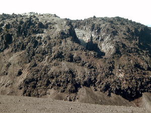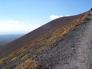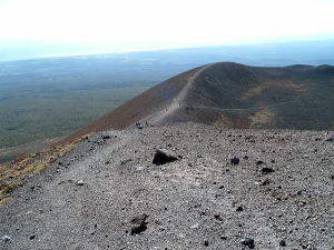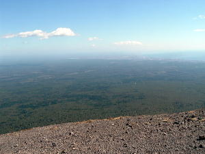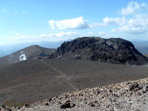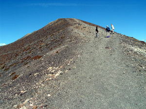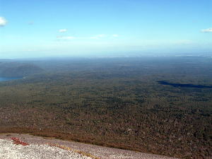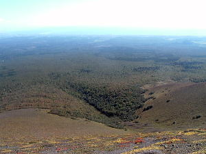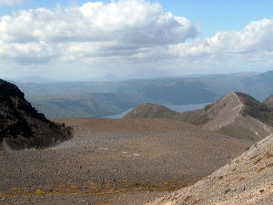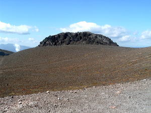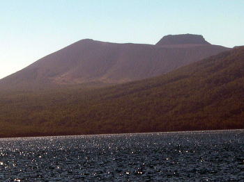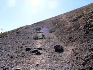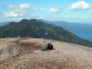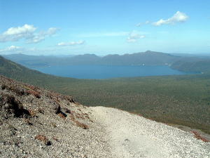 | 札幌からも近いし、車で7合目まで登れるし、眺めもいいしで、北海道ではかなりポピュラーな山のようだ。 しかしそれにしても、盆に弁当箱を乗せたようなこの不思議な形・・・なんとも強烈インパクト。あの弁当箱がいったいどうなっているのかを見んことにゃ我慢ならん。 というわけでこの軟弱ふしぎ山探検も、ついに標高1000mを超えるときがやってきたのである。 このへんです札幌から車でまっすぐ南下して1時間ちょいで、支笏湖に至る。巨大なカルデラ湖だ。その東岸をたどると、対岸正面の風不死岳の影から、このえたいのしれない活火山が姿を現す。 ![]() (左)山容とともに長く伸びる裾野が印象的 (右)北東のモラップ付近の国道から。矢印は雪国特有の道路標識 モラップで国道を離れて南へ。しばらく走ると分岐があり、「熊出没注意」の看板がある右のダート道に入る。美しい自然林をガタゴト走ること10分ほどで、7合目の駐車場に着く。 うわっ、ここは60台ほど停められる広い駐車場だが、平日だというのに50台くらい停まってるぞ。人気のある山なんだねぇ。 ![]() 「ヒュッテ」とあるところが駐車場 登山口で入山帳に名前を書いて、10:30出発。はじめのうちはナナカマド主体の森を歩くが、5分ほどで1本の木も生えていない火山性の山肌となる。 おわっ、これはすごい眺めだ! 支笏湖から苫小牧から夕張山地から・・・振り返ってじっくり眺めたい欲求にかられるが、なにかここで味わい尽くすのがもったいなくて、帰りにとっておくことにして、まずはせっせと斜面を登る。 ![]() (左)森が終わったあたりから山頂部を眺める。弁当箱は見えない (右)真夏は暑そうな日陰ゼロの斜面 山道はけっこうな急坂で、軽石が多いが、よく歩かれているので歩きやすい。登りながら山腹斜面を横切る形で南側へと周りこんで行く。それとともに太平洋が大きく広がってくる。 なんちゅー雄大な景色だ。これは大勢登るわな。 ![]() (左)外輪山のフチに人が立っているのが小さく見える (右)南は果てしない太平洋 景色を楽しみつつ一気に登ると、いよいよ外輪山に到着する。と、いきなり正面から強い風がビュービュー吹きつけてくる。そして目の前には、これまでの伸びやかな風景とはまったく異質な景観が現われる。 外輪山の内側にはペンペン草も生えない荒涼たる火口原が広がり、そのすり鉢の真ん中にデーンとあの弁当箱、もとい、溶岩ドームのお出ましだ。左側からは火山ガスが噴出している。まるで他の惑星に突然ワープしたみたい。 ![]() (左)出た〜弁当箱 (右)だがカルデラの内側は立ち入り禁止だと・・・残念! この山の最高点はあの溶岩ドームのてっぺんだが(1041m)、危険で登れないため、外輪山の最高点(東岳)が頂上となっている。で、とりあえずそこを目指す。 数分の登りで頂上着。7合目から1時間、と案内に書いてあったが、僕は40分ほどだった。最近ジョギングのせいか、けっこう馬力がついてきたからな。 頂上はこれまで以上にすごい風が吹いていて、カメラの焦点が定まらないくらい。でも当然ながら360度の大絶景だ。内側のカルデラも大迫力で、その全貌がよくわかる。 ![]() (左)外輪山に出たところから頂上まではすぐ (右)頂上から見た溶岩ドーム 弁当箱アップ、やさしさのカケラもない荒々しさ地図で見ると火口カルデラは直径1.2kmほどで、中央の溶岩ドームは直径500mほど。さらに溶岩ドームの中もすり鉢状に窪んでいて、内側中央に火口丘があるらしい。ドーム外壁の一部がザックリ裂けていて、内部が窪んでいるのがわずかに見える(上の写真)。 樽前山自体が巨大な支笏湖カルデラの外輪山を形成していることを考えると、3重のカルデラと言えるだろう。 ![]() (左)北西には遠く羊蹄山が見える (右)北に鎮座する風不死岳は緑の山 ![]() (左)東は広大な樹海のかなたに苫小牧とウトナイ湖 (右)南の太平洋方面。尾根の右側はカルデラ内部 あまりの強風に体温を奪われ、寒くて仕方ないので早々に下山する。帰りは来た道をなかば駆け足でがんがん下る。 下るあいだじゅうずっと、なにひとつ遮るもののない、This is 北海道!な景色に全身を包まれっぱなし。両手を広げて「でっかいどぉ〜っ」と叫びたくなっちゃうよ。まったくもって感動あるのみ。 ![]() (左)すばらしすぎる支笏湖 (右)そして雄大な裾野を埋め尽くす樹海がすごい 駐車場に着いたら11:30だった。「下り40分」のところを20分で下りてしまった。 いやまあしかし、こんなに手軽な歩きで雄大な風景と過激なカルデラを堪能できるとは、人気があるのも当然だな。今度はぜひ子どもらを連れて来てやりたい。 (05.10.5) ![]() (左)支笏湖の北岸にそびえる恵庭岳(1319.7m)もふしぎな山 (右)山頂部拡大、謎の岩塔が俺を呼ぶぜ 千歳空港から見た樽前山、弁当箱は目立たない |