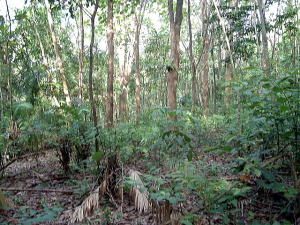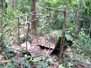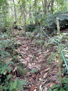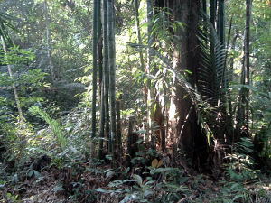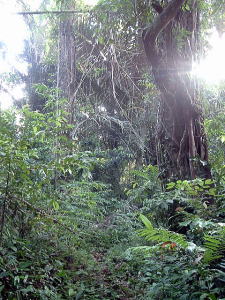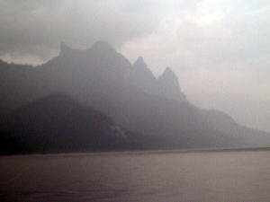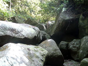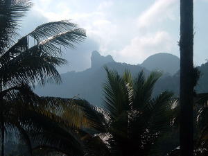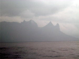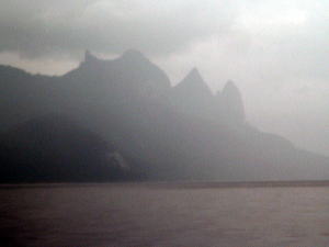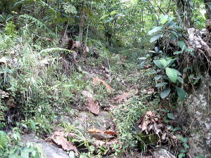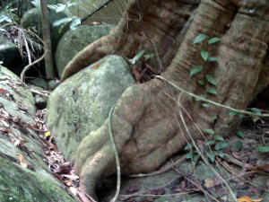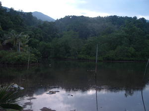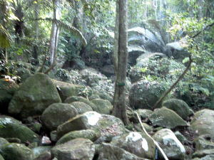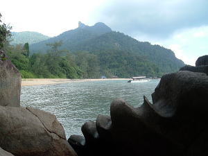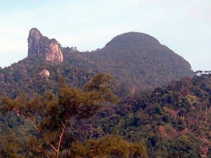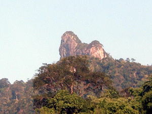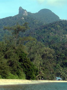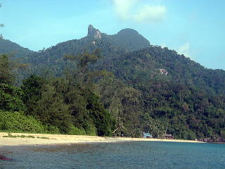 日が当たると石になってしまう、という難儀な性質のマレーシア雌ドラゴンが、中国の雄ドラゴンに恋をした。2匹は夜な夜な逢引をしていたが、ある夜いつまでたっても現れない雄ドラを待つうちに夜が空け、待ちぼうけを食わされた彼女は石になってしまった。 その哀れな雌ドラ石が南シナ海に浮かんでいるという。マレーシアのティオマン島だ。 少女峰、ヌスクマーペーなど各地の辛酸なめ子ちゃん山を慰めにまわっている俺が、この雌ドラちゃんをほうっておけようはずがない。いま会いにゆきます! というわけでマレーシア東海岸、メルシンという町から船に乗ってティオマン島へ向かう。安くあげようとしたら日本から3日かかっちゃった。 ティオマン島はマレー半島から50kmほど離れた小豆島サイズ(たぶん)の島だ。2時間ほど船に揺られるうち、前方のモンスーン雲の合間から、哀れな伝説の雌ドラゴンの影が見えてくる。 ![]() (左)南海に横たわる不気味な巨大ドラゴンの影 (右)頭部拡大、まぎれもなくドラゴンだ ドラゴン頭部周辺の岩峰群は通称「イヤーズ・オブ・ドラゴン」と呼ばれる。 4つのピークが見えるが、右側の鋭いツインピークスはロッククライミングの世界で「ドラゴンズ・ホーンズ」と呼ばれているようだ。その2本が「角セット」だとすると、左側にあるドーム型+小岩峰が「耳セット」かな。 いろいろ資料を見たがそれぞれ表記が異なり、これらの正式な名前も標高も結局ようわからんかった(ややこしい山名詮索は本レポート末尾にまとめた)。 船がティオマン島に近づくにつれ、「角セット」は徐々に「耳セット」の影に隠れていき、最後には完全に見えなくなる。 ![]() (左)ギザギザが一列に並んだらますますドラゴンだが・・・ (右)だんだんくっついて・・・ 2本のツノが消えちゃったやがて島で最初の寄港地、ゲンティン村に着いた。ここで下船し、小さなボートに乗り換えて、ゲンティン村の南数kmにあるニパーというところへ向かう(ゲンティンとニパーの間に道はない)。 ニパーには質素なシャレー(宿泊小屋)がいくつか並ぶ地味なリゾート施設が1軒だけある。 ニパー海岸からの耳セット当初は「角セット」のツインピークスに近いムクッ村に行くつもりだった。でもメルシンの旅行社のおばちゃんに聞くと、「ムクッは石の浜よ。砂浜のきれいなニパーはどう? ニパーからでも山には行けるはず」とおっしゃた。 ニパーは「耳セット」のドーム型+小岩峰に近い。 たしかに今回は息子(中1)も一緒で、彼は砂浜のほうが嬉しいだろう。それに角セットの岩峰に素手で登れるとも思えんし・・・と考え、おばちゃんの意見に従うことにした。ドーム(たぶんドラゴン頭部4山の主峰)の頂上に立てたら、鋭い角セットが眼前に迫るものすごい景色が見られるに違いない。 ニパーに着いて山を見上げると、平和なシルエットのドームの横で小岩峰がグイッと上を向いているさまが、なんとも不思議で印象的だ。両者の関係は広島の烏帽子岩山を大きくしたような感じだな。 小岩峰と言っても、近くで見ると登攀意欲がそそられる立派なものだ。宿の若いマレー人に「あの岩はなんという名前?」と聞いたが、わからないらしい。そこへニパーで一番の長老が現れ、こう言った。 「あれはライオンロックじゃ。左側が頭、右側が尻尾に見えるじゃろう」 ![]() (左)ドームとライオンロックからなる「耳セット」 (右)ライオンロック拡大。ちゃんと目も口もある 言われてみれば確かにナナメ後方から見た雄ライオンに見える。それじゃドラゴン伝説はどこへ行ったのかという気もするが、長老の意見に逆らってはいけない。 ライオンロックは、ドームとの鞍部に出て背後からアプローチすれば登れそうに見える。 俺は長老に、「あの岩には行けるのか?」と聞いた。すると長老はこう言った。 「行ける。ラグーンの向こう側は乾いていてトレイルがある。しかし森の中は暑い」 なんと、道があるのか! これは有難い。地図はないけど、見た感じさほど複雑な地形でもなさそうなので大丈夫だろう。 さっそく翌朝9時、息子を残して山へと向かった。 英語能力ゼロの息子を一人で置いていくのは心配だったが、彼はズボンの下半分(取り外し式)をシンガポールの宿に忘れてきたので仕方がない。半ズボンでジャングル探検なんかしたらエライ目に遭うに決まっている。 ![]() (左)ビーチの裏にあるラグーン (右)やや不安な雲行き 教えられたとおりにラグーンの左側を回りこむと、草地に細い道らしきものがついている。これだな。道はすぐに森に入り、登り坂になる。たしかに蒸し暑いが、日本の梅雨時の山とさして変わらない。これなら行けるぞぉ。 いったん伏流水になった谷を渡り、すぐまた登る。 ![]() (左)いい道やん (右)熱帯雨林っぽくなってきた ![]() (左)よっしゃ来い! (右)また谷に出た。正面の木の幹に青いプレートがある 10分ほどで再び谷に出た。大きな石がゴロゴロした谷で、取水用の細いパイプが何本