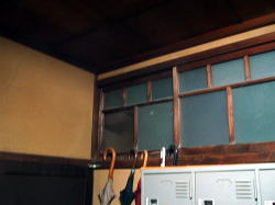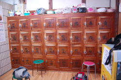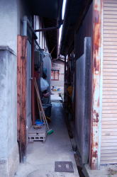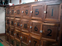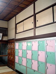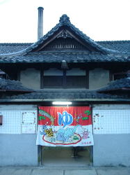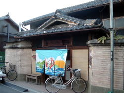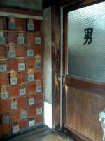 JR桜井線に乗るたび、桜井駅の少し北の線路そばに見える煙突が気になっていた。 で、この日は山之辺の道を歩く前に、まずはこの銭湯探索に直行だ。 桜井駅から北東に歩いて10分たらず。古い商店などが並ぶ狭い通りをゆくと、あの煙突がチラリと見える。かなり痛んでいる感じ。 近づくと、通りから10m近く奥まったところに銭湯発見。まだ昼前なので当然暖簾は下りていないが、青瓦の玄関小屋根の下に田舎情緒爆発系の渋い木の戸が少し開いていて、そこで柴犬が番をしている。 そのようすがもうたまらない。近寄ると、柴が元気よく吠えかかってくる。よしよし、あとでまた来てやるからなと約束して、とりあえず山之辺の道へ向かう。 これ見て入らずにおれますか、あなた?そして夕方。たっぷり汗をかいて戻ってきた。今度は暖簾がさわやかに揺れている。柴は左奥の犬小屋につながれている。 暖簾をくぐると、玄関スペースは小さなお寺のような渋い木の空間。下駄箱は新しいが、脱衣所への戸や上がりがまちの風情がたまらない。瞬時に”ほっこりオーラ”に包まれる。 使い込まれた木の引き戸をなめらかに開けると、これまた使い込まれた木の番台がお出迎え。誰も座っていなかったが、すぐに表からじいさんが来た。 ![]() (左)郷愁オーラがオーレ♪の玄関スペース (右)脱衣ロッカー 脱衣所のいにしえ度も高い。さすがはまほろばの地。前栽、木のロッカー、そして男女仕切り壁がまた泣くしかないような激渋の年代もの。 めずらしいのは天井で、ゆるいカマボコ型のコンクリ天井になっている。こういうのは初めて見た。 浴室は飾り気のないシンプル空間。 湯舟は中央にタイル張りの深風呂、その男女壁側にL字型の浅風呂がある。ジェットもなにもなし。湯舟のフチには濃抹茶色の1×2cmの細かい長方形タイルがびっしり張られている。 歩いてくたびれた体をゆったりと沈める。あぁ〜むぅ〜、・・・どうしても声が出てしまうのぉ。 湯温は深が42度くらい、浅は40度くらい。深の底面はちょっとデコボコしていて、年季を感じさせられる。 首まで浸かりながら壁に目をやると、低い位置に普通の民家的な格子窓がある。開け放たれて外気が吹き込み、なんとも気持ちいい。 カランの水はかなり冷たく、湯は思い切り熱湯が出る。これも古銭湯の味わい。シャワーもあるが湯圧弱い。 出入り口横に男女壁をぶち抜く共用の水鉢あり。お湯で茹だってはその水を浴びまくる。 水鉢の横の男女壁の下にくり貫かれた共用の排水口があり、使った湯は湯舟周りの溝からその穴に吸い込まれていく。これも古いスタイルだ。 上がりはサイダーなどの販売あり。奈良から続く山之辺の道の終点にある、素朴な味わいの銭湯だ。(2005.9.17) 外へ出ると、とっぷり日が暮れていた |
