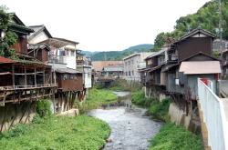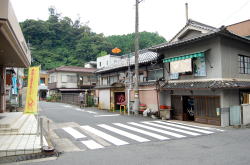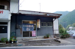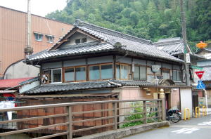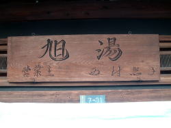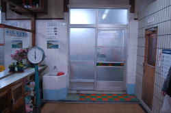 近鉄吉野線がすっかり山の中に埋没してからやっと辿り着く駅、下市口。ここで下りて吉野川にかかる千石橋を渡り、国道309に沿って南へ15分くらい歩く。 と、秋野川にかかる橋のたもとにたたずむは・・・ああ、涙ちょちょぎれダイナマイト系の銭湯やおまへんか。 川の上流に見えてくる風呂がどうの以前に、風景として素晴らしい。ジスイズジャパン。今ここに銭湯がありそれに巡り会えた奇跡がこの胸にあふれて俺は空も飛べるはず。 情緒たっぷり年季どっしりの入母屋づくり。玄関上には小さな唐破風なのかアーチ状の小屋根がついていて、そこに苔が生えている。 アーチの上には「日の出湯」の電照看板、これは三角柱を横にしたような形をしている。さらにアーチ下側には屋号にあわせた旭日海軍旗柄の装飾ときちゃうんだ。 その周辺の壁やなんやの洗い出しのイニシエ風情が俺の急所をモロに突いてくる。 早鐘のような胸の高鳴りをかかえて木の戸を開けると、ああもうこの世界に今まさに巡り会えた奇跡がこの胸にあふれて俺はいったいどうしたらもこうしたらもありゃしない。 タタキに低い激レトロ番台があるが、よく見たらこれにも真っ赤な朝日マークが入っている。その上には立派な神棚あり。下駄箱は言わずもがなの木製骨董品、鍵が木の板のデカイやつ。 脱衣所は格天井で、男女壁の上部には透かし彫りがある。 こげ茶色の木製脱衣箱には「壱、弐、参・・・」の漢数字・・・と思いきや、「弐」は中の部分が「貝」の字になっているさらに古い書体だ。 浴室入口の両サイドにはタイル絵もある。「椿」と「鶴」で、表面に凹凸があるマジョリカ風。 脱衣所中央に置かれた古い木のベンチも渋い。壁に飾られている絵などもいい味を出している。 もうこの時点で俺は前後左右から強烈パンチを連打されている状態、立っているのがやっとだ。 でも風呂に入りに来たんだった。ふらふらと裸になって浴室へ進む。 風呂場は比較的新しい白タイル張りだが、新しいといっても建物に比較しての話で、イニシエ風情は十分だ。 まず目を引かれるのは、カマボコ型天井の上部壁にあるモザイクタイル画。おだやかな山、川、森が涼やかに描かれている。 男女壁に沿って深浅の湯舟があり、ふちや外側段には黒御影石が使われている。浅にはジェットもある。 ちょうどいい湯加減のお湯はやわらかい。あとで聞くと、井戸水と水道水が半々だそうだが、水道水もこのあたりじゃ水質が悪かろうはずがない。 湯船奥の一段高いスペースには、濃緑と白、細かな笹の葉柄の見たことのないタイルがびっしりと貼られていて、思わず目を見張った。 カラン周囲にはかわいい花柄タイルが使われ、壁の中断には青っぽいひし形模様のマジョリカタイル。その上部にはガラスブロックがはめられている。 出入り口の横には扇形の水鉢もあって、見所いっぱいだ。 あがっておやじさんに聞くと、この建物は昭和元年築だが、風呂屋はその前からあったらしい。浴室は、以前は石畳の床だったそうだ。 おやじさんは元々この隣家に住んでいたが、昭和32か33年頃、この風呂屋の主人から「跡継ぎがおらんからやらないか」と言われて引き継いだ。いまは一人でお湯を沸かし続けておられる。 お客は近所の常連ばかりだが、おやじさんは一人一人に「ありがとうございます」ときちんと挨拶する、真面目で気持ちのいい人柄だ。 下市は割り箸の産地だ。昔は夜11時頃まで工場が動き、客が来たという。 現在の営業時間は午後3時半から9時だが、3時12分に客が来るので開けている。 遠いけど、銭湯好きなら間違いなく感動できる。行くしかない。 (08.8.7) 隣の吉野町の世界遺産にも負けてない |