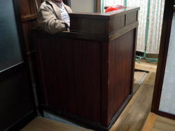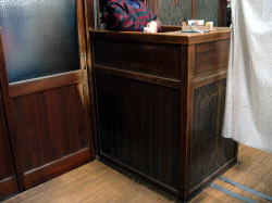 JR高田駅からならまっすぐ西へ徒歩5分、近鉄の大和高田駅からなら南へ徒歩7〜8分くらい。いかつーい四角のレンガ煙突が見えてくる。 存在感ばりばり前に回ると、高度成長期的な間口横断型の平面玄関にシャッターと、無機質に改装されてしまっている。が、上部には古〜い破風屋根が見えている。 渋銭ファンとしてはビミョーな心境で暖簾をくぐる。と、出ました、むお〜っと漂うイニシエのオーラ! 濃厚な色合いの木造空間だ。 高い格天井の手前小窓から見えている脱衣所の天井が、おいでおいでをしているよ。 ![]() (左)正面こげ茶 (右)手前は傘入れ、奥は下駄箱、みごとにこげ茶 高い格天井もこげ茶時を遡るミラクルドアをススーッと開けて、黄泉の国、もとい、夢の国へ足を踏み入れる。 いぶし銀の木の番台に、おかみさんが座る。湯銭320円、奈良県の組合料金より30円安いぞ、うれしいな。 次の瞬間、前を向いた俺は腰を抜かしそうになった。・・・な、な、ナヌーーーー!!?? ![]() ここここ、こっこっこっこれは・・・想像を絶する巨大な鳥居が、男女仕切り壁の上に天井からぶら下がっている。縦横1.5mはあるぞ! 古い銭湯ではこの位置に神棚があるのは一般的だが、その前にこのような巨大鳥居があるのはまったくもって初めて見た。 あとでおかみさんに「この鳥居はすごいですね」と言うと、 「気づかれましたか、案外気がつかない人もおるんです」とおっしゃった。これに気づかない人がいるとは信じられん。おかみさんによると、鳥居の一番上の黒と赤の木は継ぎ足しのない1本の木材からできているそうだ。 天井は、地方銭湯にしては高い。格天井ではないが、アメ色にいいツヤが出ている。おかみさんによると屋久杉なんだそうだ。 ロッカーは、アルミものを左右でケヤキ一枚板の木製ロッカーがはさむ。アルミロッカー部分は、かつては棚に脱衣籠を置く形式だったらしい。 ロッカーと上の戸袋との間の黒っぽい梁、これがまた素晴らしい材質。なんだか知らないが緻密でスベッスベ、そうとうな高級木材であることは間違いない。とにかくそのへんに使われている木がいちいち値打ちもんだ。 手前に前栽がある。狭いが池があり、ちゃんと水が張られている。 ![]() (左)木製ロッカーは手前にもある (右)この木、すごいよマジで 浴室方面を見ると、奥に長い中庭があり、その横が浴室への通路になっている。うなぎの寝床的敷地だな。 と、ここでも、な、な、ナヌーーーー!!?? あれに見えるは確かに・・・なんとその通路部分にカランと鏡が3〜4セットあるぞ。これも初めて見た。たいていここには流しなんかがあるわけだが・・・。 あとでおかみさんに聞くと、昔お客の多かった時代に、カランの空き待ちを少しでも減らしてお客をさばくために設置したものだという。そういう時代があったわけね。しみじみ。 通路横の中庭には噴水があり、暗くてよく見えなかったが魚が泳いでいる様子。しかしこの通路、裸で通るのは少し寒いな。 浴室も縦に細長い。湯気もうもうで、奥のほうは霞んでいる。 床は意外にも新し目のタイルで改装されているが、湯舟は御影石の深と浅、外側の座り段も昔ながらの石のままだ。ジェットも気泡もなんもなし。 湯をさわってみると、深が43度強、浅が42度弱のマイベスト湯温。たっぷりかかり湯して、冷え切った身体をゆったりと沈める。あぁ・・・(言葉なし) おっ、深風呂の内側にも石の座り段があるが、この段の石は底までズドーンの一枚ものだ。厚さ15cmはある巨大石材。岡山の柳湯や戎湯と同じだが、それらより磨かれている感じが好印象だ。 浅風呂には男女壁に岩があしらわれ、豆タイルの背もたれスペースが2人分後付けで設置されている。たいていこういう部分にはジェットがあるもんだが、あくまで背もたれだけ。 湯気でかすんで最初のうちはよく見えなかったが、奥壁に大きなタイル絵がある。湖に朱塗りの太鼓橋がかかっているが、後ろの山のかたちは北海道の駒ケ岳だ。とすると大沼公園だな。 カランは入口近くにシャワーなしが4組と、奥にシャワーつきが6組ほどある。圧力よし。台座部分にはこれまたどっしりと御影石が据えられている。 先客は2人いたが、やがて貸切になった。とたんに限りなき静寂が訪れる。 あがりは飲み物販売あり。スコールを飲む。 おかみさんによると築80年、大正時代の建物だそうだ。 外観から浴室まで部分的に改装されてはいるが、大鳥居、通路カランなど初めて見たもの多し。脱衣所の高級木材や石の湯舟の重量感、タイル絵なども大切に残されている。その反面、シャワーも設置されていて使い勝手も悪くない。 激渋銭湯の聖地、大和高田・・・恐るべし。(2006.1.29) 紺の鶴亀オリジナル暖簾も渋い |
