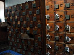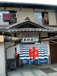 近鉄奈良駅から南東へ徒歩10分少々、福智院町バス停の手前。江戸時代の街並みが残る奈良町に溶け込む、渋い小銭湯だ。 低い番台には70歳くらいのばあさんが座り、客はじいさんが数人。脱衣場は格子の天井や剥げたしっくい壁などにひなびた味わいが色濃く残っている。 ロッカーが3ヵ所に分かれて配置されているのがちょっとめずらしい。 浴室はシンプルで、男女仕切り壁と奥の壁とに接して四角いメイン浴槽と、ややぬるい気泡浴槽が1つずつ。浴室の壁や湯船は最近改装されたようで、建物の外観に似合わずタイルはピッカピカ。 しかし床は昔のままの石畳だ。石と石の間はタイルがはめられて排水のための溝になっているパターンだが、石畳が湯船を頂点に大きく傾斜しており、しかも排水溝が下流部でぐぐっと深くなっている。 これほど変化に富んだ床を持つ銭湯はめずらしかろう。じつに味わい深し。 (03.7.11) |