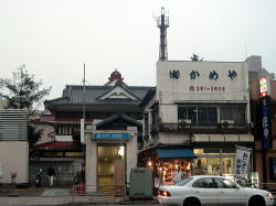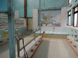 小田原駅から東へ8分くらい歩くと、南北の道路に面して古い銭湯あり。 大阪のレトロモダン銭湯みたいな凸型の看板建築、その下に赤トタンの破風玄関がかわいらしくついていて、暖簾の下には郷愁バリバリのコゲ茶色の引き戸。 帰りの列車の時刻が気になりながらも、これは入ってしまうでしょう。 ![]() 入口付近の泣ける風情戸を開けると、狭いタタキに靴がたくさん脱ぎ捨ててある。左手に下駄箱はあるんだが。 番台におやじが座っている。湯銭は380円? 神奈川は東京都ともに日本一高い430円のはずだが・・・「小田原はこの値段です」だって。まあ安いことはいいことだ。 板張り床の狭い脱衣所は、壁を合板で改装してあるが、木目調でなかなかよろし。でも時間もあんまりないから急いでハダカになる。 浴室もこじんまりで、2段式の天井も低め。奥2槽、手前カランの関東式だが、8つのカランがちょうど8人の先客で埋まっている。開店直後はやっぱり賑やかだな。 そして奥壁に出ました、富士山のペンキ絵。おだやか~な印象の富士山だ。 湯舟は深43度、浅42度くらいで、ともに気泡噴出。列車に長時間乗る前に、じっくり腰を温めていくとしよう。 床タイルやカラン周りは新しいタイルが張りかえられていて清潔。小さいけど、生活銭湯としては申し分ない。 8人が上がった後しばらく貸切になったが、すぐにまた3人ほど入ってきた。 地元に愛される、気持ちのいい銭湯だ。 (2007.1.18) 横から浴室を見たところ |