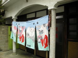 雲仙普賢岳に登ったあと、島原半島南部の有家(ありえ)方面行きのバスに乗った。火山地形をうねうねと下り、海岸線に出たところの須川港でバスを降りる。 国道に平行して、商店などが並ぶ狭い道がある。そこを歩くと・・・ややっ、前方に水色が! ![]() (左)道の先に・・・ (右)水色ハウス、でも建物自体は純和風 ![]() (左)側面。銭湯だよな (右)まぎれもなく 水色は広島あたりの銭湯でよく見かける色調だが、ここまで建物全体が水色化しているのは見たことがない。しかも最近このようにしたみたいで、きれいだぞ。 暖簾も何も出ていないが、風呂道具を持った人の出入りがあるので、やってるみたいだ。 戸を開けて中に入ると・・・狭い! タタキも狭いが、脱衣場も奥行きがなく、すぐそこが浴室だ。天井も低い。いやーこれはアットホームというか、俺の勉強部屋にしたいよ(なんでや)。 こじんまりした空間だが、ここも外壁同様、オフホワイト系のやさしい色できれいに塗られていて、ボロさを全然感じさせない。 小さな番台には、やさしげなおかみさんが座っている。風呂賃、170円だと! 驚いて「えらい安いですね」と言うと、 「ずっとあげてないんです」とおっしゃる。 浴室もこじんまり。タイル張りの四角い湯舟がひとつあるだけのシンプル空間だ。そしてここの壁は薄いパステルグリーンに塗られている。 ややぬるめのお湯は、バスクリン系の緑色入浴剤入りだ。 先客のじいさんが上がって、一人のんびり浸かっていると、まもなく別のじいさん2人と若者一人が入ってきた。 3人は和気藹々と楽しげに話しているが、その会話を横で聞いてても全然わからない。長崎弁ってこんなに難しかったっけ? 「ヒラメ4キロ」以外、一切理解できなかった。たぶん漁師の浜言葉なんだろうけど・・・。 3人はヨソモノの俺にはまったくかまわず、ウミンチュ語で談笑し続けていた。 九州西海岸はかつて琉球から連なる独自の海洋文化圏に属していたらしいが、日本もまだまだ広いなあ。 上がっておかみさんに聞くと、建物自体は戦後のものだそうだ。 言葉もわからない辺鄙な港にある荒川湯は、コンパクトだがきれいに管理された、さわやかなパステル銭湯だった。(2008.4.7) |