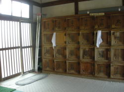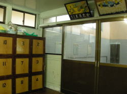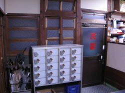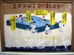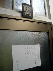 佐世保駅から2kmほど離れた佐世保市役所前でバスを降り、市役所北側の道を西へ入って徒歩2分。突き当たりに光る「ゆ」の電光看板を見つけて思わず駆け足になる。これを風呂バカと呼ぶ。 なんともいえぬ、ええ風情電光看板の前で左を見たら昭和中期的な木造モルタル一般民家風、暖簾はないが入口の奥に「男」「女」の入口が並んでいる。 ![]() (左)建物入口から (右)男女別の戸は新しい茶色アルミ、張り紙は正月の営業予定 戸を開けると過去最狭のタタキ、靴2足で埋まりそう。 左にこげ茶の古い木製下駄箱、右にこれまた古い木製番台。妙に丁寧で真面目そうなオヤジが座っていて、俺を一見客と見るやロッカーの鍵の使用法まで説明してくれる。俺を誰だと思っとるのかね? 泣く子も浸ける風呂バカだぞ。 脱衣所は、手前から奥に行くにしたがってだんだん広くなる遠近法な間取り。ロッカーは木製だが、全体に昭和中期な合板系改装が施され、さりげなくエアロバイクが置かれたりしている。 が・・・やややっ! こっこっこ、これはいったい・・・これは身長計か? 身長計は古い銭湯の基本アイテムの一つではあるが、こいつはタダ者ではない。普通の身長計は直径5cmほどの角棒に目盛りがついたものだが、ここの身長計は角棒の左右両脇に、それぞれ幅12cmほどの板が上から下まで取り付けられている。つまりこの身長計は棒ではなく、幅30cmほどの縦長の板状をなしている。 そしてその板は片側4つ(合計8つ)の広告枠に区切られ、質屋・ブリキ屋・時計屋、あるいは「みなさまの美容室まりも」など、いったいいつの時代に存在したのかというような商店の広告が色を違えて掲載されている。 まるで身長計商店街。こんなの初めて見た! マニアなら気絶の危険大。 浴室は中型の広さで、かなり古めかしい。壁・天井のペンキやタイルはけっこうキテル感じだが、意外にもお客が7~8名いる。 男女の仕切り壁は木枠に曇りガラスで、ちょっと珍しい。その下にある主浴槽は、浴室のサイズの割に大きく、熱めのお湯がたっぷりなのが嬉しい。 奥に入浴剤入りの副浴槽、こちらも入るとお湯がザバーでよろしいなあ。 カランやシャワーは古いけど快調に作動する。カランの湯は猛烈に熱い。 壁の中ほどに、長方形の花柄マジョリカタイルが浴室をぐるっと1周するかたちで1列に張られているのがキュートなアクセントになっている。 上がりは飲み物販売なし。 建物外観はどうってことないが、身長計の存在感が圧倒的。お湯たっぷりの大きな湯舟もよい。銭湯の少なくなった佐世保で、地元民に愛される貴重な湯屋だ。 (2006.12.29) |