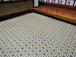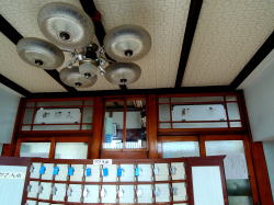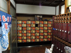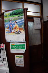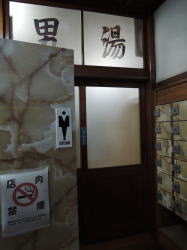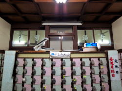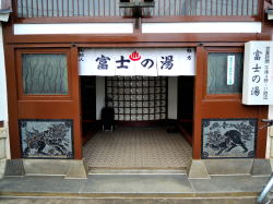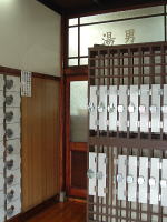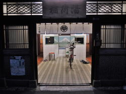 いつもなぜかしら東京の夜はベロンベロン。千鳥足で知人にヨチヨチついて行ったら、神楽坂のくねくね路地を何度も曲がったあげく、ここへ案内された。 そして知人は「ここは熱いよ」と言いおいて帰っていった。 狭い路地の奥、千鳥破風の伝統的銭湯だ。渋いのぉ・・・とりあえず暖簾をくぐる。 ![]() (左)ちょっとかわった暖簾 (右)磨かれた下駄箱 ![]() 女湯(左写真)、男湯(右写真)それぞれの入口にはカーブのついた目隠しがある 中に入ると、番台におかみさんが座っている。わりとこじんまりした銭湯ね。 脱衣所も典型的な伝統系東京銭湯。床はニスで磨かれ、高い平格天井はマス目が大きくて渋い色。男女壁には磨き丸太が乗っている。 浴室は全面ガラス張りで番台から丸見え、やたらと明るいのがトキオ式。 そして当然のごとく出ました、正面奥壁に男女ぶち抜きの富士山ペンキ絵、早川師。その下に鯉と金魚の九谷焼タイル絵。定番中の定番だ。 その下に並ぶ深浅の湯舟は、深いほうが狭くて気泡あり、浅いほうが広くてジェットあり、の約束パターン。 お湯はたしかに熱い。43度強か、もしかしたら44度あるかも。でもこれでこそ東京銭湯。ビールでふやけた心身にビシッと焼き入れたらんかい。 見上げれば天井は水色に塗られた2段式、どうしようもなく東京銭湯。 男女隔壁にもタイル絵がある。雪山と湖の図柄。 カランまわりは台が広く、湯水の出は極めて良く、下のステンレス溝はたまらなく清潔で、じつに使いやすい。なにもかもが典型的な東京銭湯ストロングスタイル。 上がりは牛乳などあり。もうじき日付けが変わりそうな時間だけど、相客は5~6人いた。テレビ見ながら他客とだべってくつろいだ。 (2008.7.27) 酔いもだいぶ醒めてきたぞ |